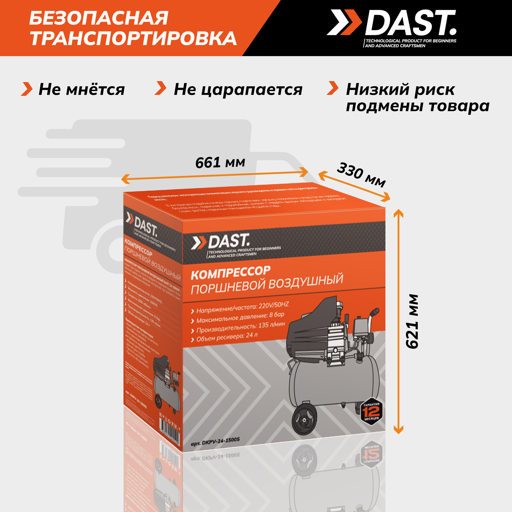 Ниже Вы можете прочитать отзывы на Компрессор поршневой масляный DAST 24 л, 135 л/мин, 1500 Вт, быстросъемный коннектор, кабель 1,3 м, DKPV-24-1500S, ознакомится с подробными характеристиками, посмотреть интересные обзоры и фотографии на Компрессор поршневой масляный DAST 24 л, 135 л/мин, 1500 Вт, быстросъемный коннектор, кабель 1,3 м, DKPV-24-1500S.