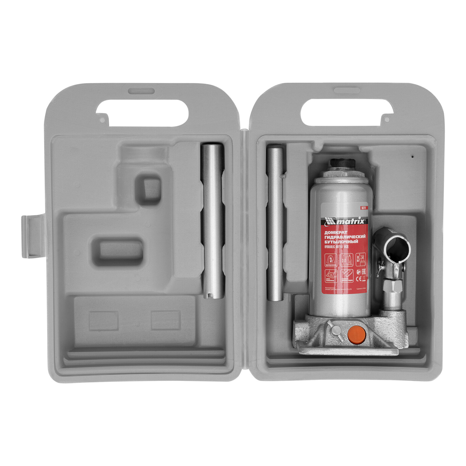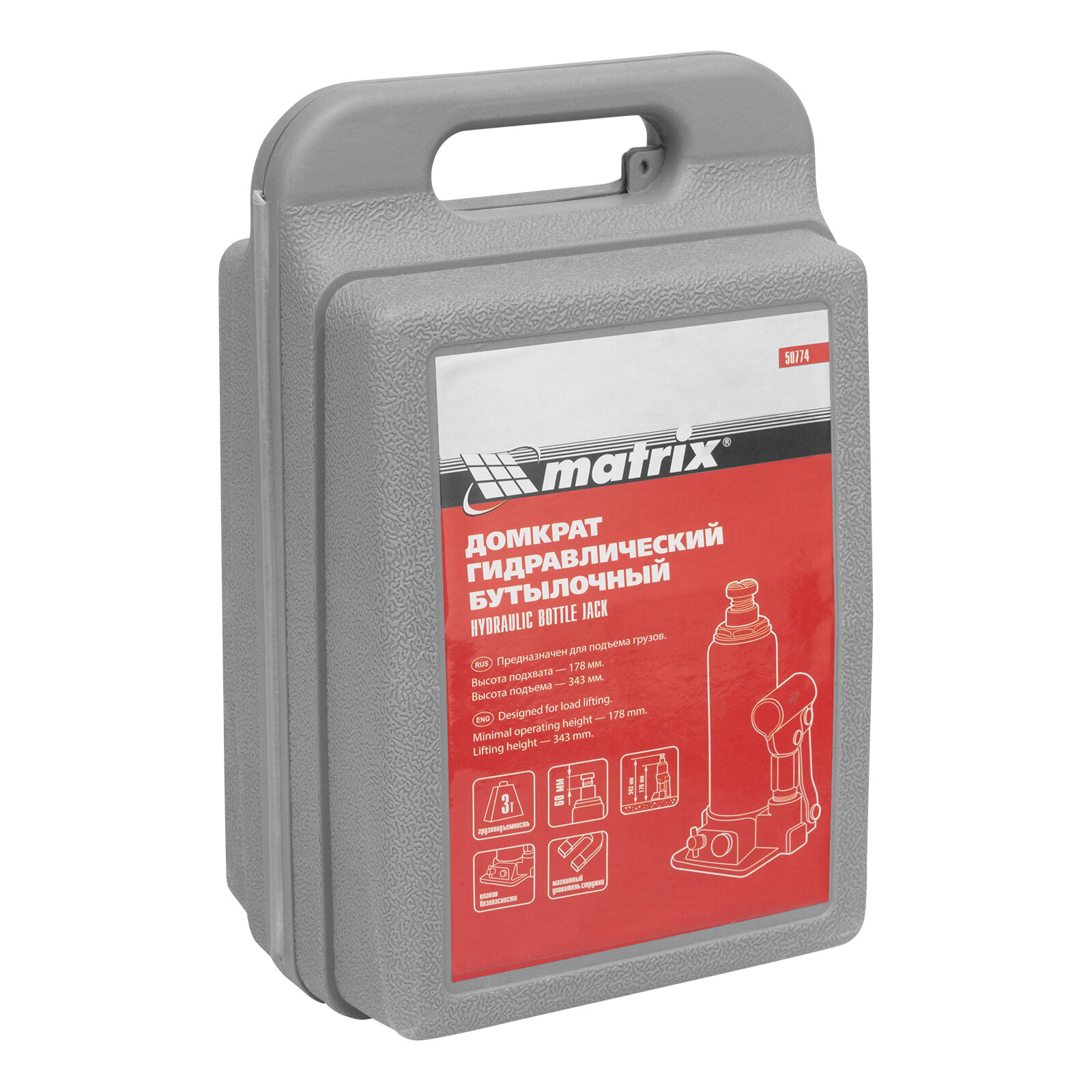 Купить Домкрат гидравлический бутылочный, 3 т, h подъема 178-343 мм, в пластиковом кейсе Matrix 50774