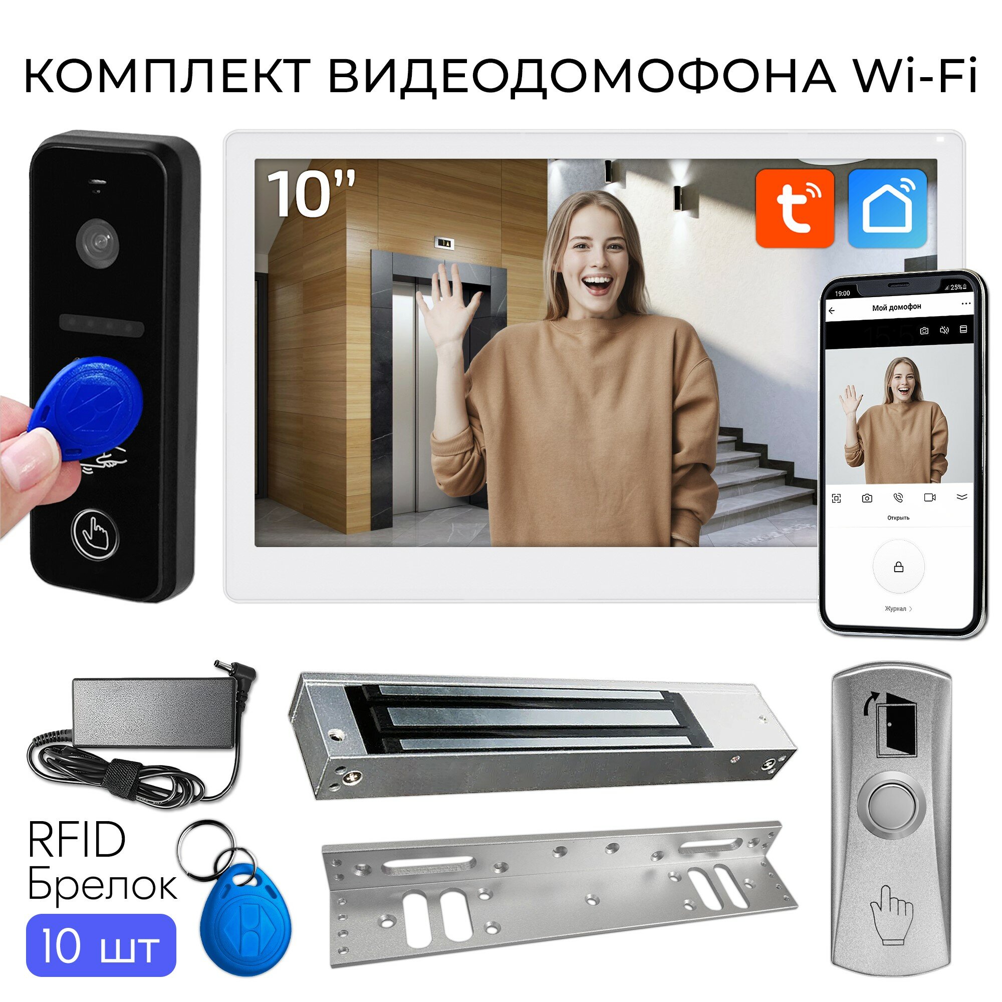 Купить Комплект видеодомофона Wi-Fi 10", вызывная панель со встроенным считывателем , электромагнитный замок 280кг - Белый