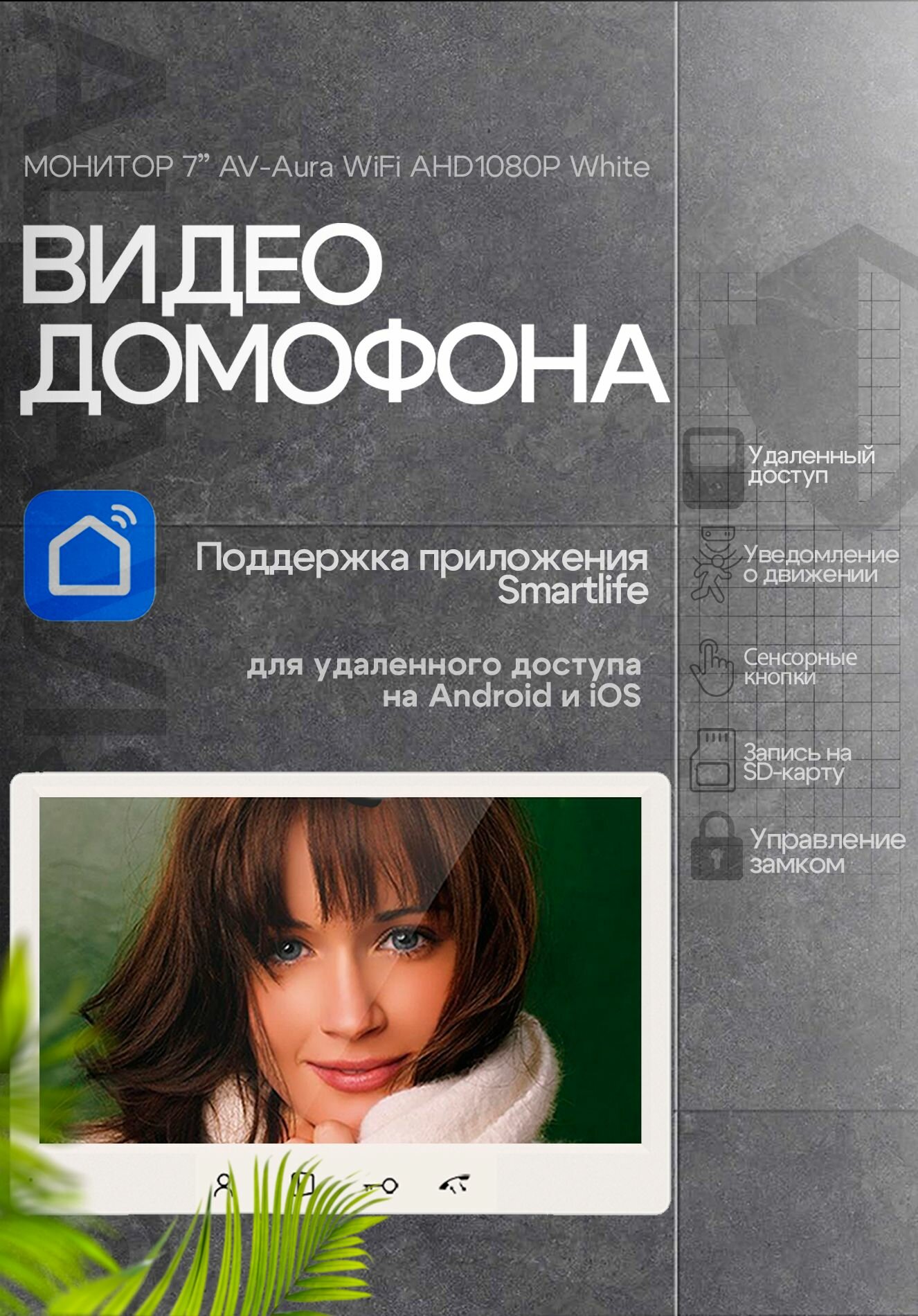 Видеодомофон Aura White Wi-Fi AHD Full HD. Экран 7". Поддержка Android и IOS. Совместим с подъездным домофоном через модуль сопряжения. интересное: