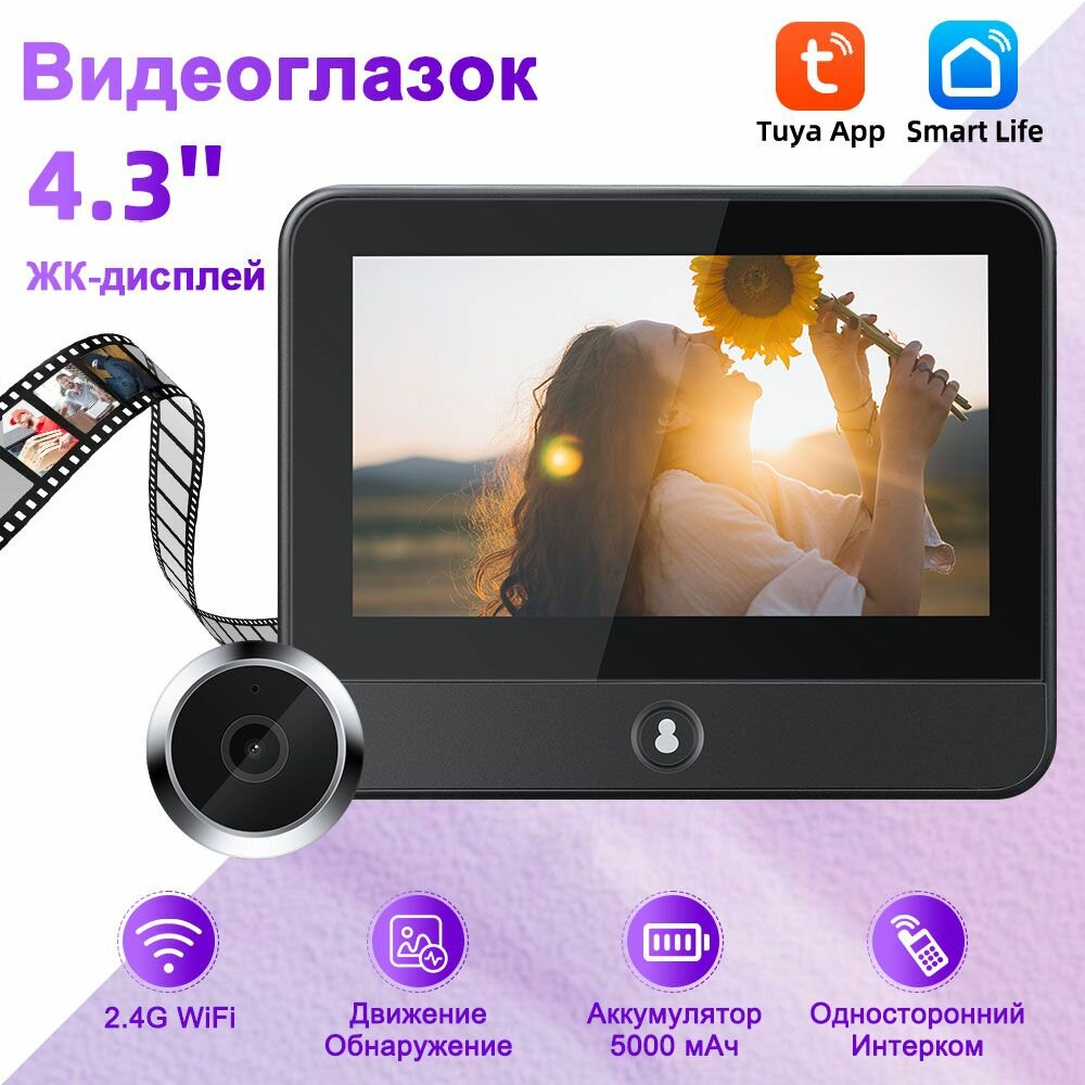 Купить WiFi видеоглазок для входной двери S50, с датчиком движения и запись,120 Широкий угол,4,3-дюймовый дисплей