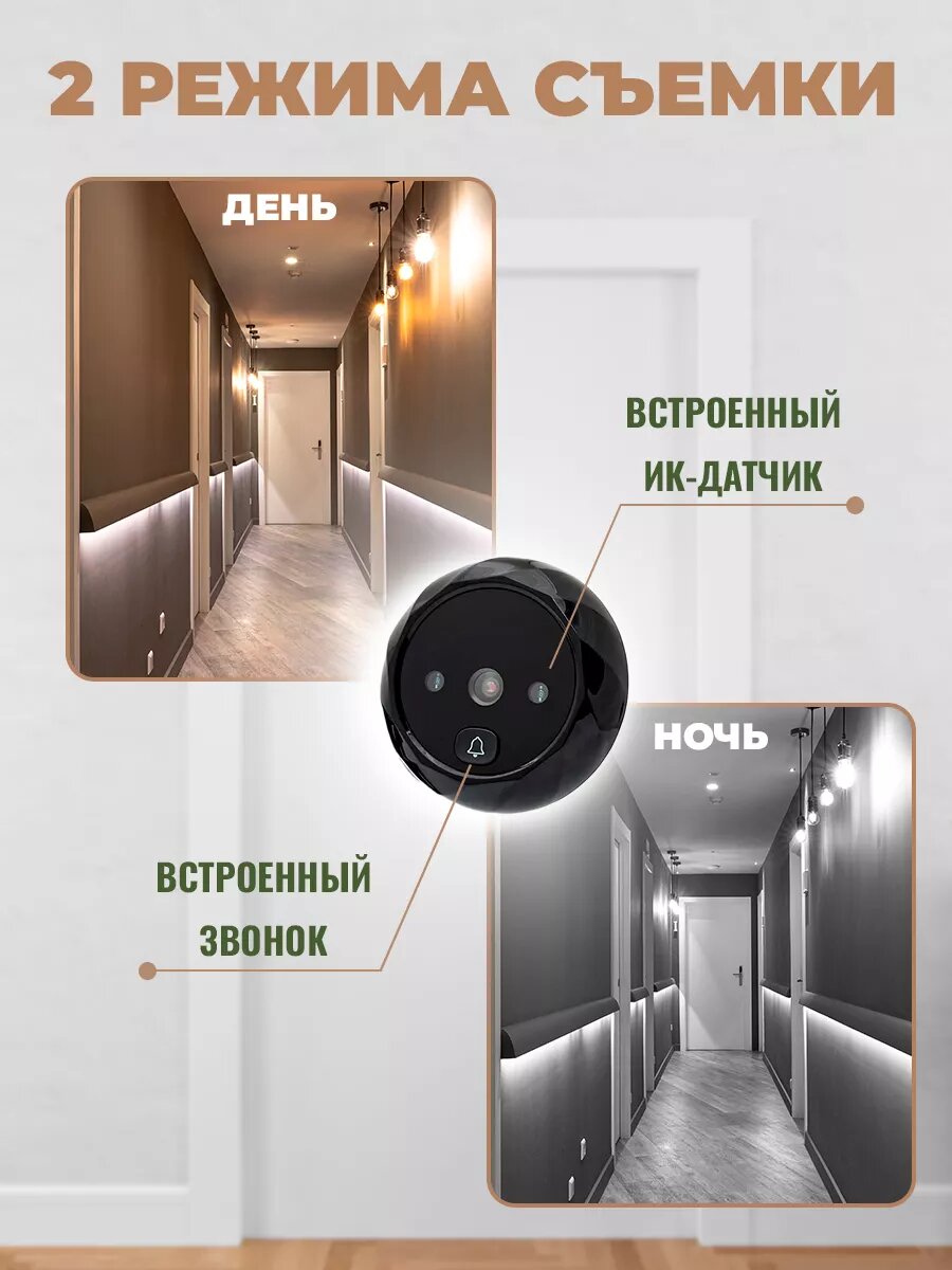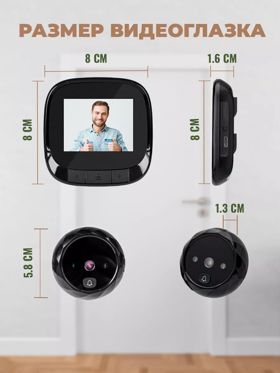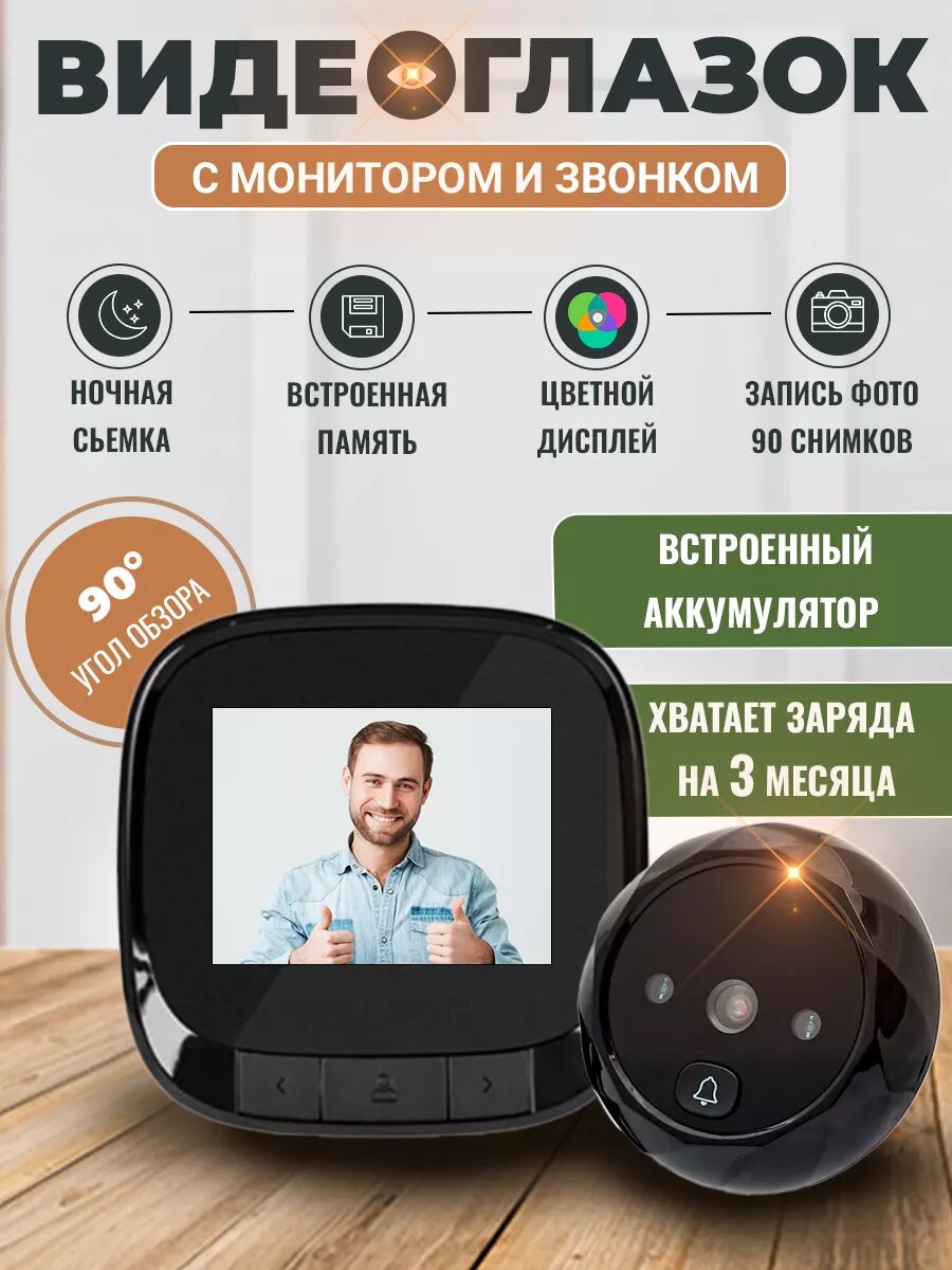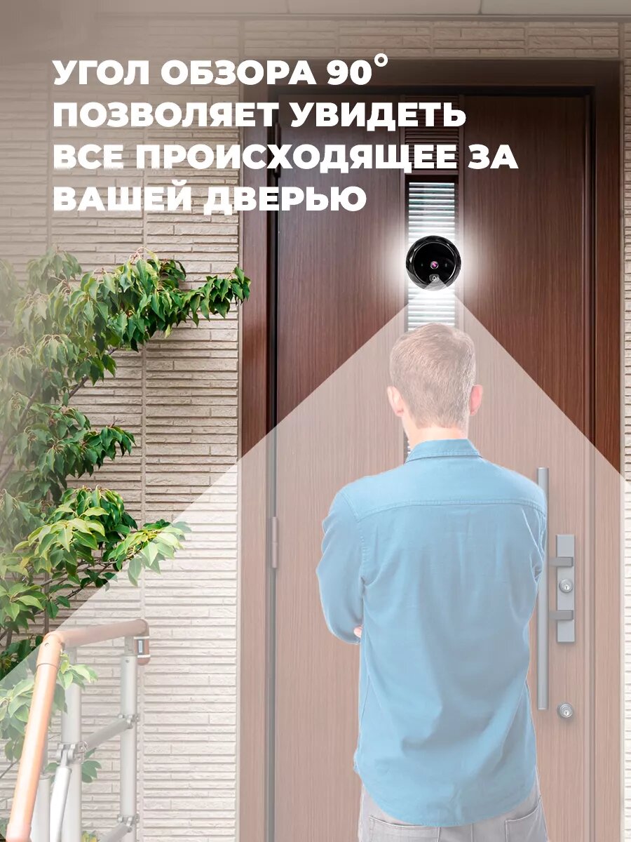 Видеоглазок для входной двери с фото записью и звонком, углом обзора 90°, чёрный интересное: