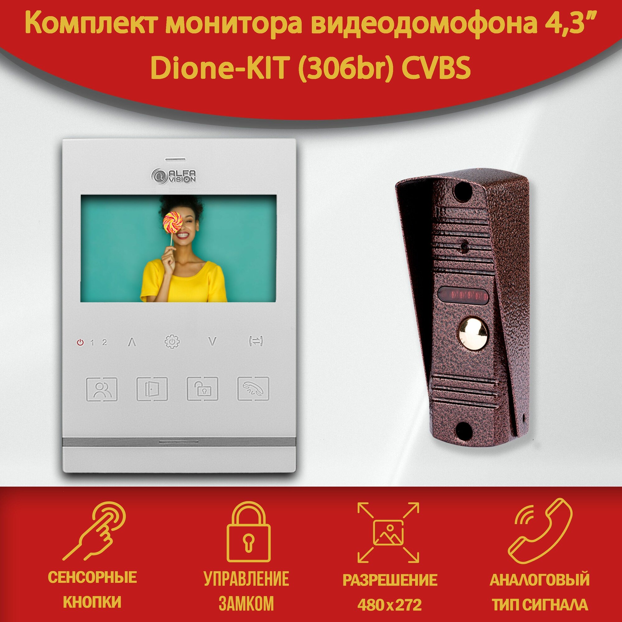 Комплект видеодомофона Dione KIT (306br). Экран 4.3". Совместим с подъездным домофоном через МС. интересное: