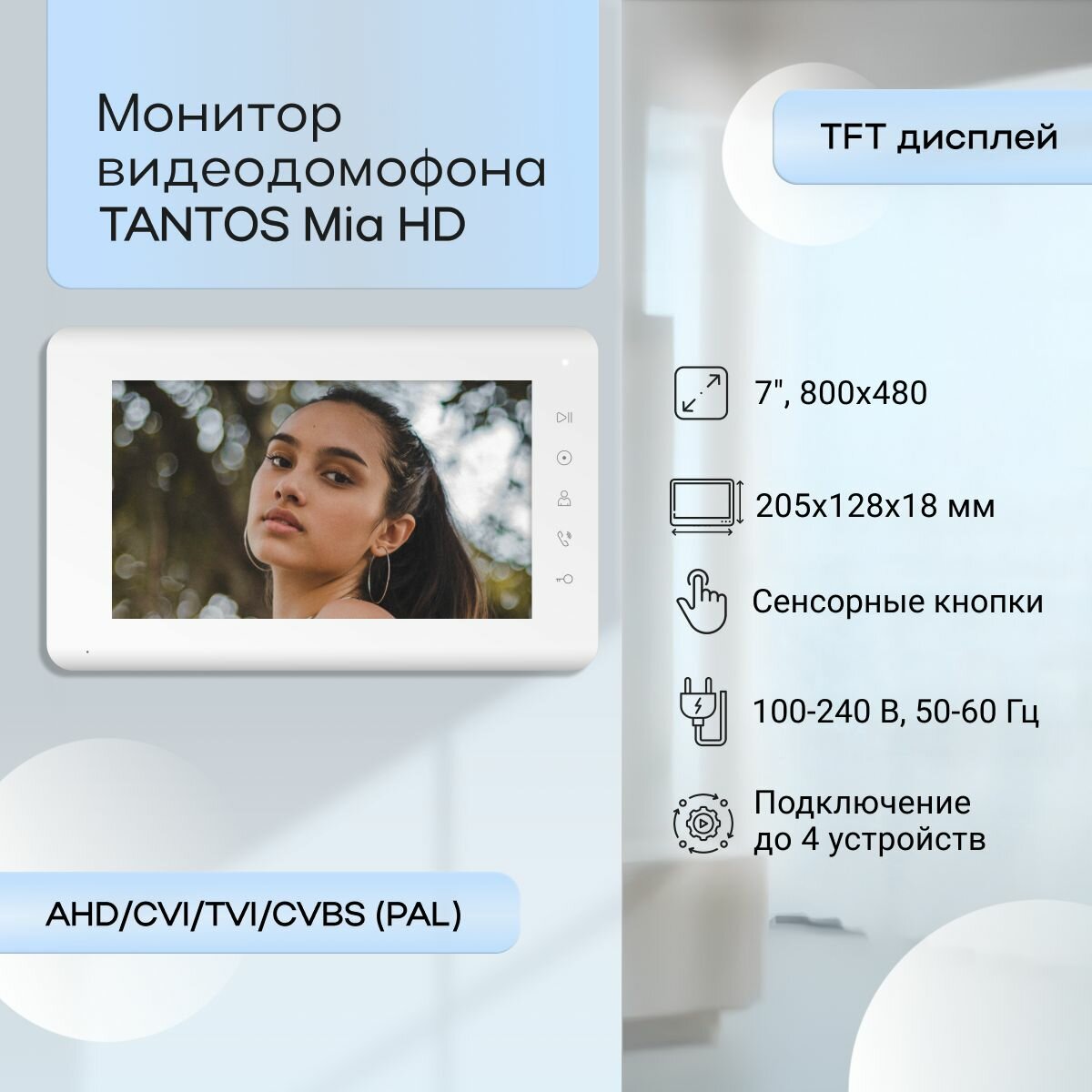 Купить Монитор для домофона Tantos "Mia HD", 7 дюймов, сенсорный, AHD/TVI, белый