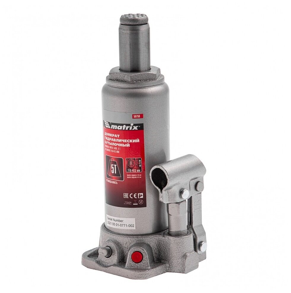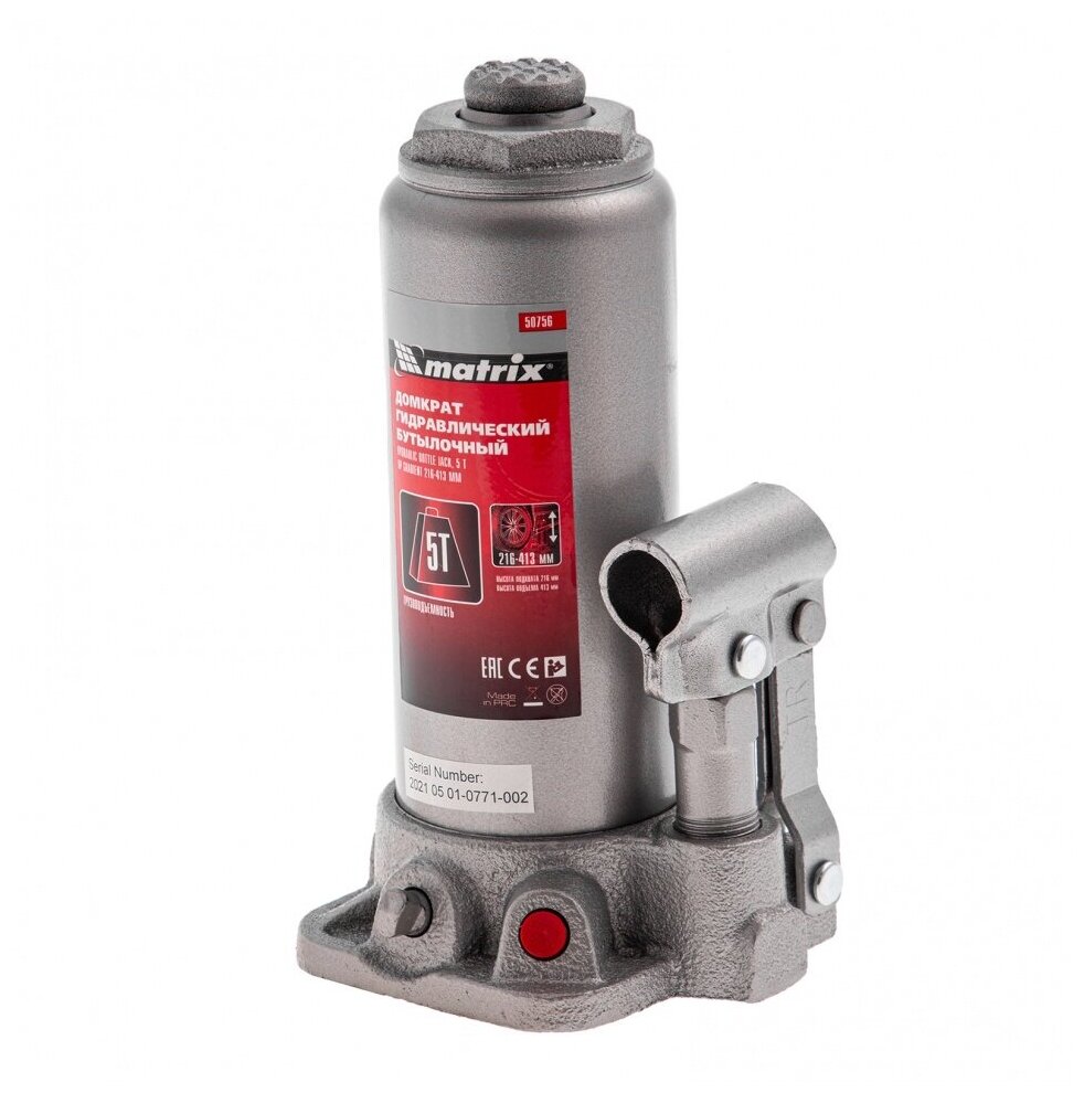 Домкрат гидравлический Matrix 50765, бутылочный, 6 т, высота подъема 216-413 мм .