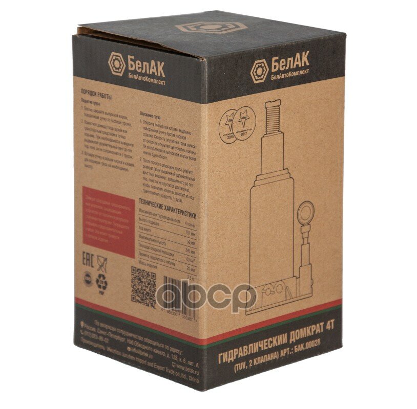 Домкрат 4 Тонны (Tuv, 2 Клапана) "Белак" (170Мм-335Мм) Белак Арт. Бак.00028 БелАК арт. БАК00028