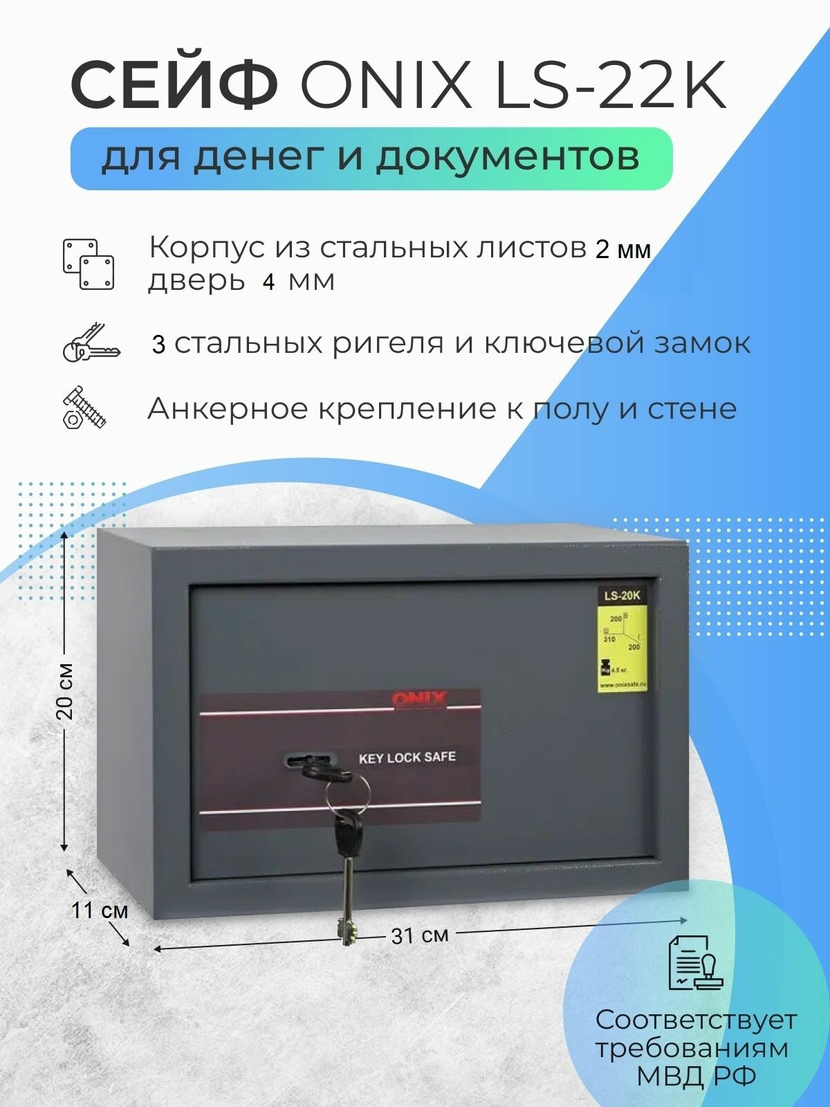 Купить Сейф Onix LS-22K для денег и документов для дома и офиса, с ключевым замком, 200x310x110 мм