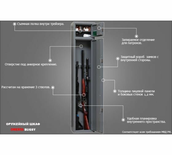 СохранитьСейф оружейный OMERTA BUGSY на 3 ствола (В/Ш/Г, мм 1500х300х200) интересное: