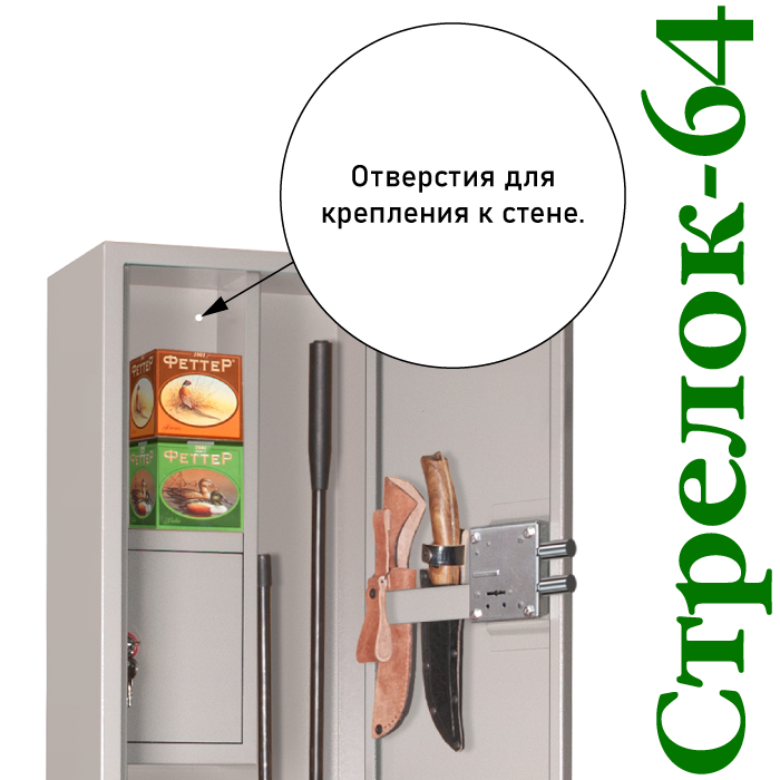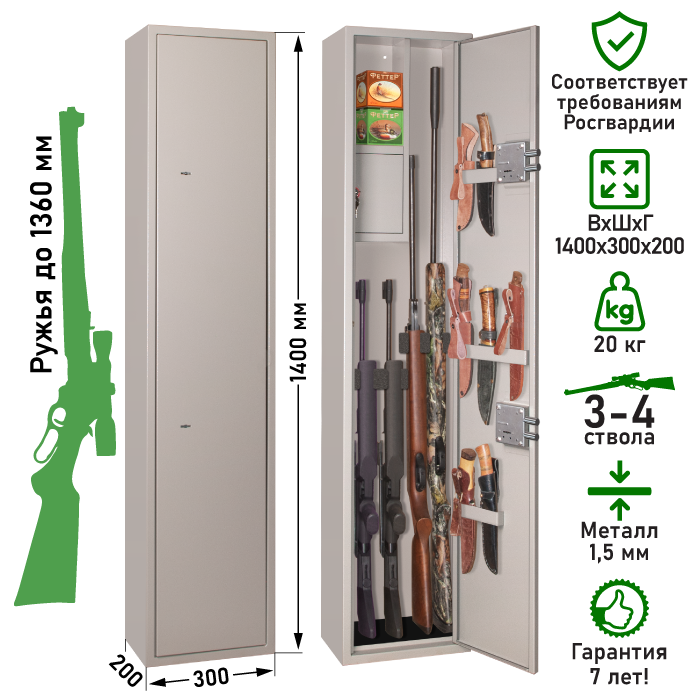 Оружейный шкаф Стрелок-64 для хранения до 4 единиц оружия высотой до 1360 мм, размер 1400х300х200 мм, вес 20 кг интересное: