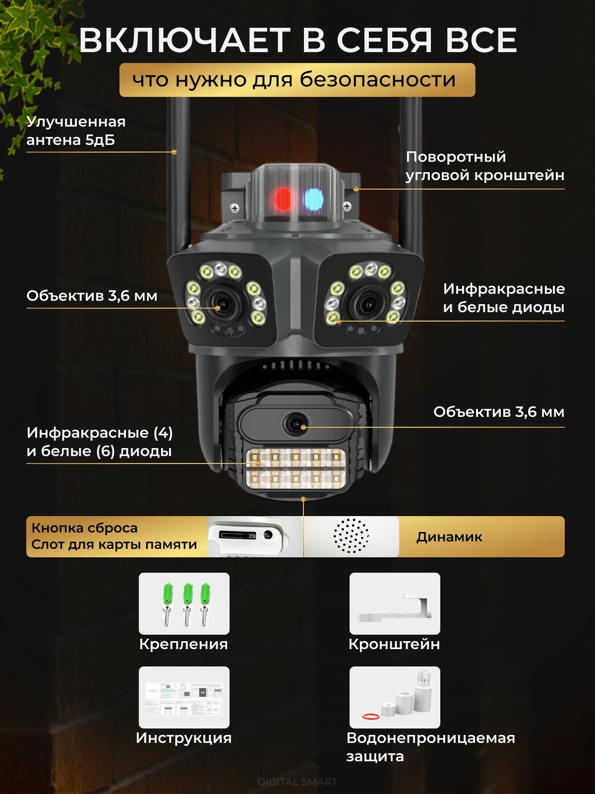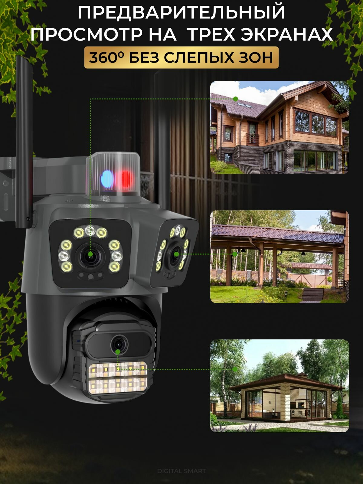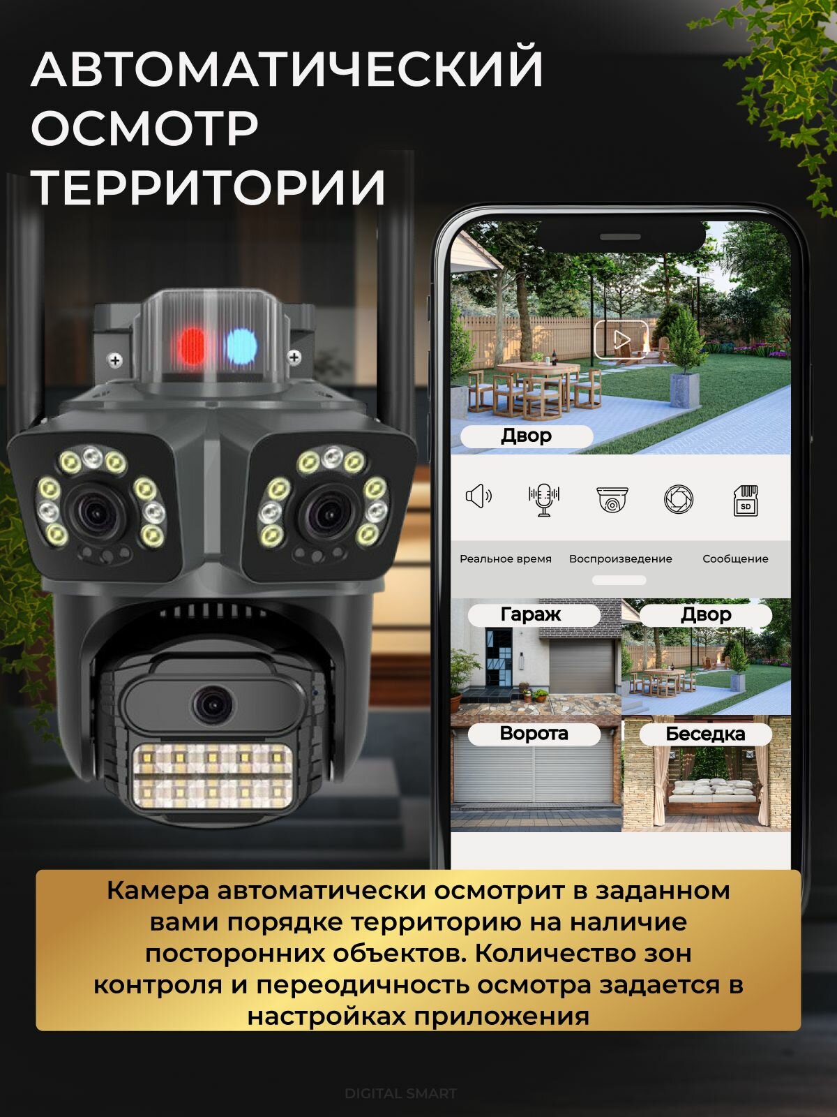 Камера видеонаблюдения уличная WiFi 6Мп тройная, поворотная IP видеокамера с датчиком движения, режимом ночной съемки
