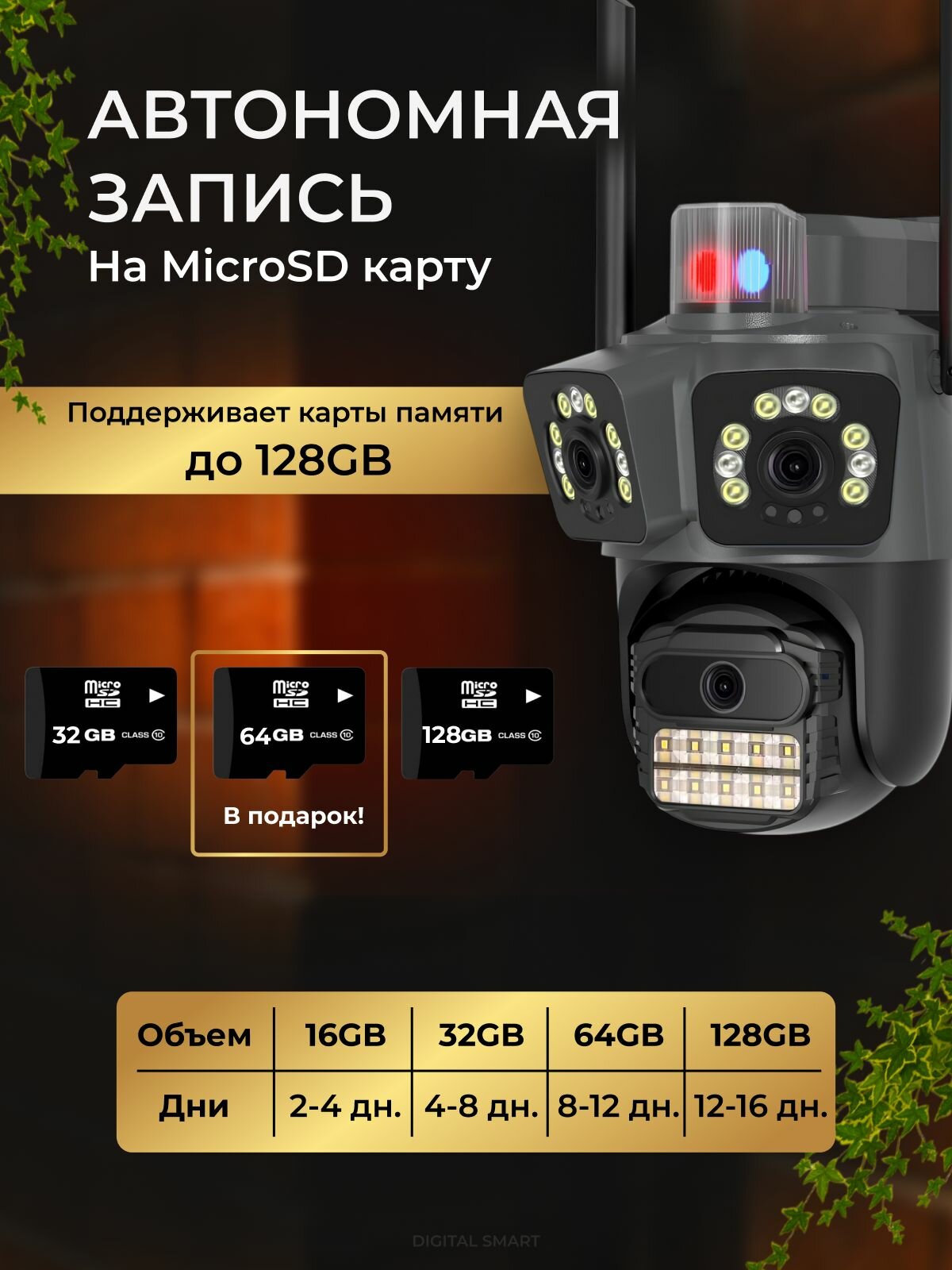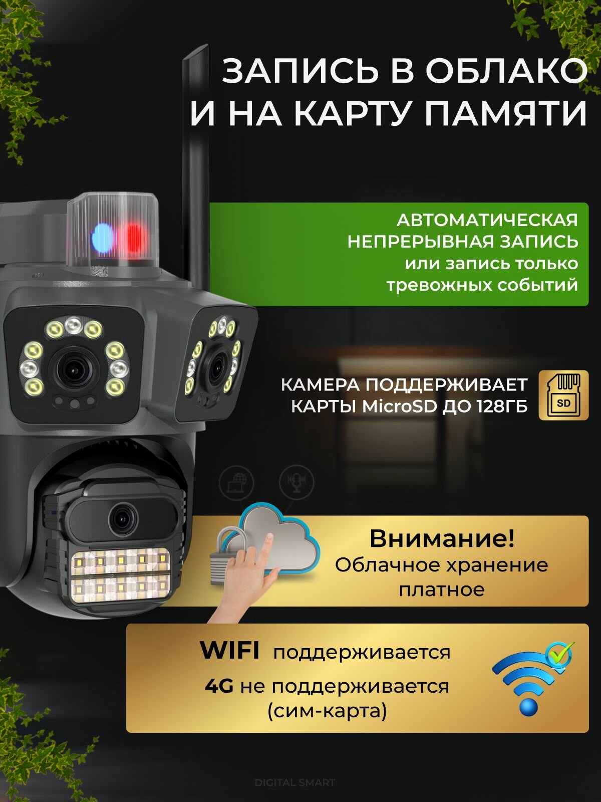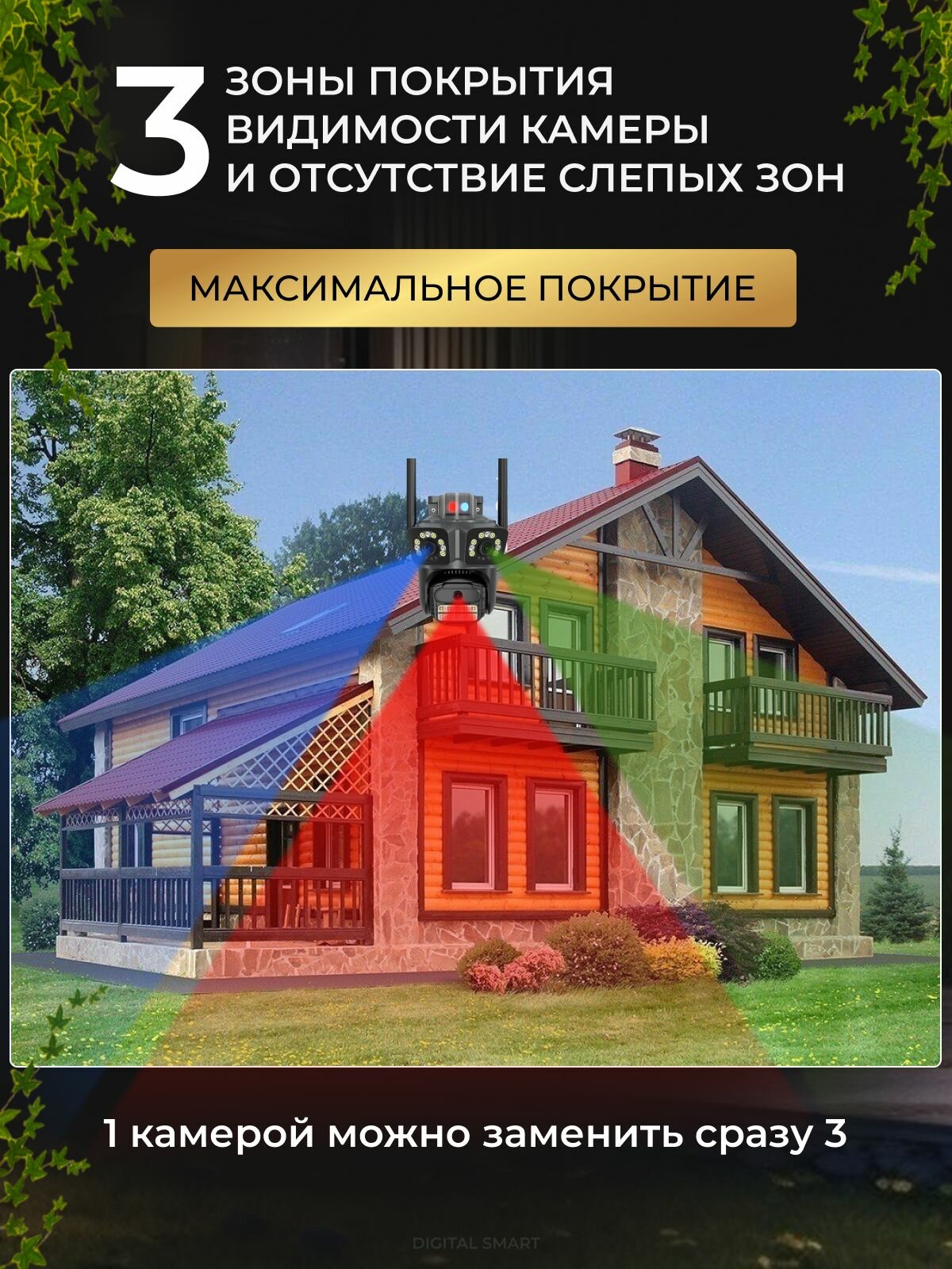 Камера видеонаблюдения уличная WiFi 6Мп тройная, поворотная IP видеокамера с датчиком движения, режимом ночной съемки