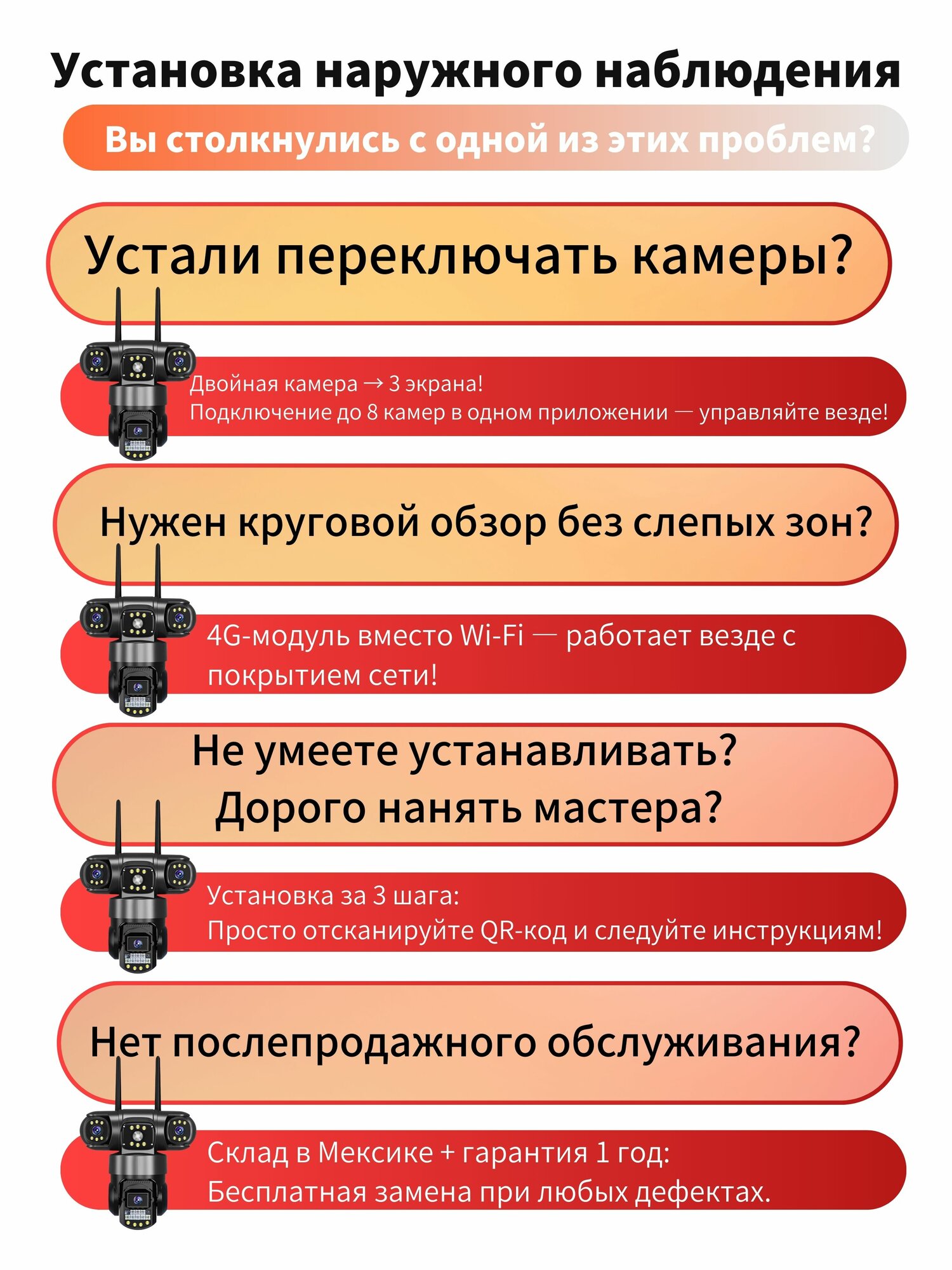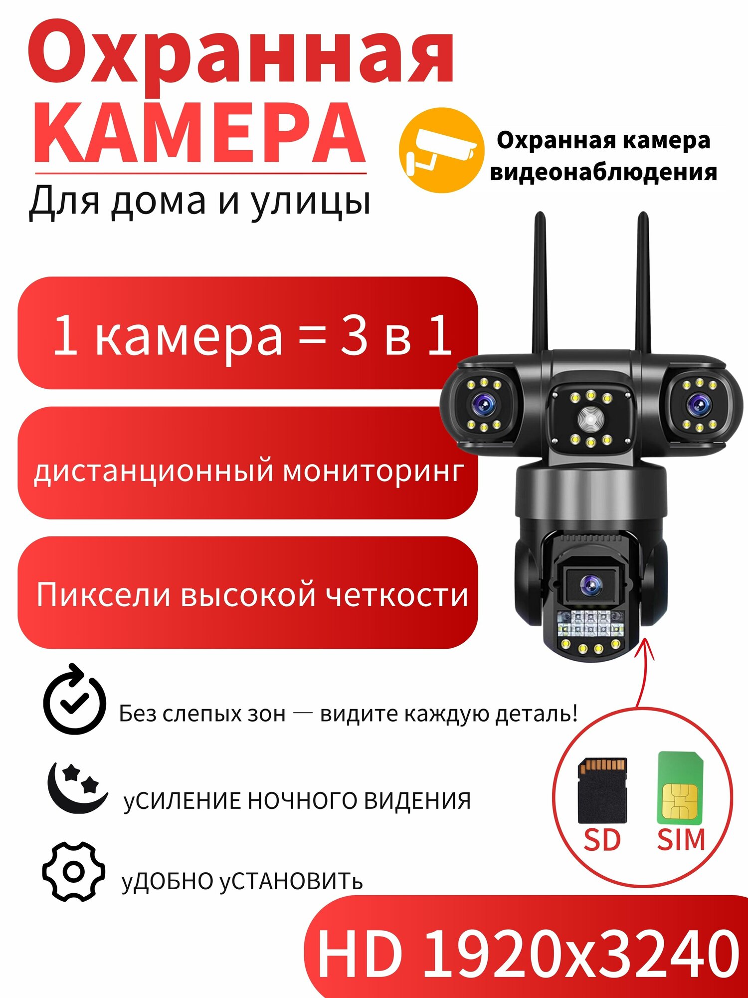 Купить 6MP уличная HD-камера видеонаблюдения с тройным объективом, ночным видением, 4G и удалённым управлением со смартфона