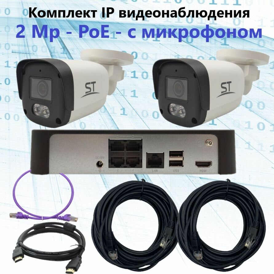 Купить Комплект IP видеонаблюдения уличный на 2 камеры, IP, PoE, 2Мп, со звуком, кабель 2х20м
