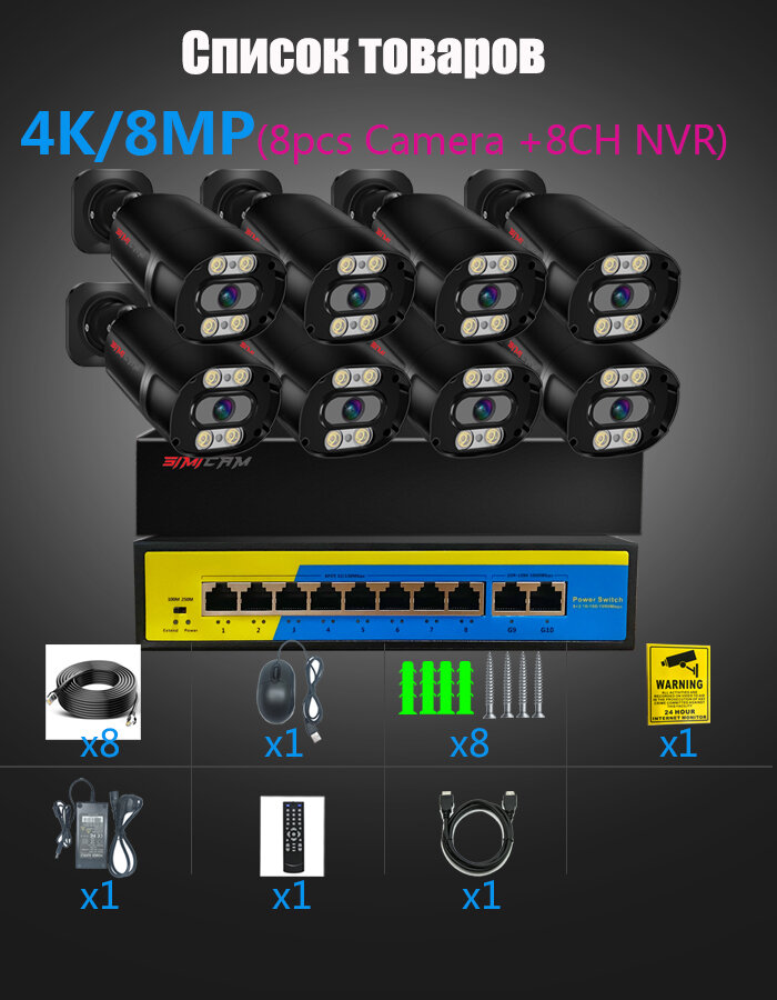 4K система видеонаблюдения комплект видеонаблюдения на 8 камер H.265 8-канальный NVR с PoE 8 Мп аудио интересное: