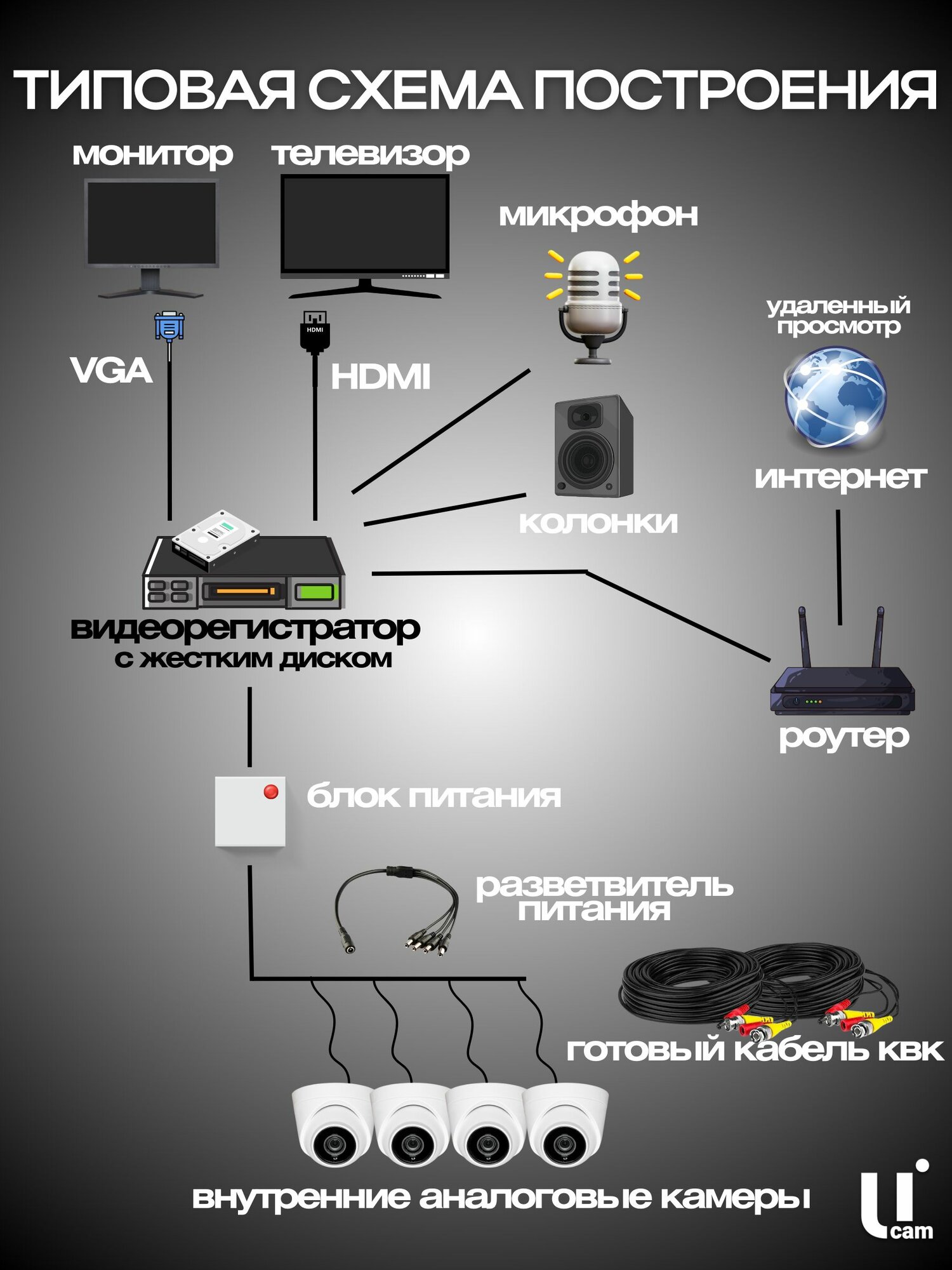 Система видеонаблюдения Ucam, 4 канала, 8 камер, ИК-подсветка, 2Мп, Full HD