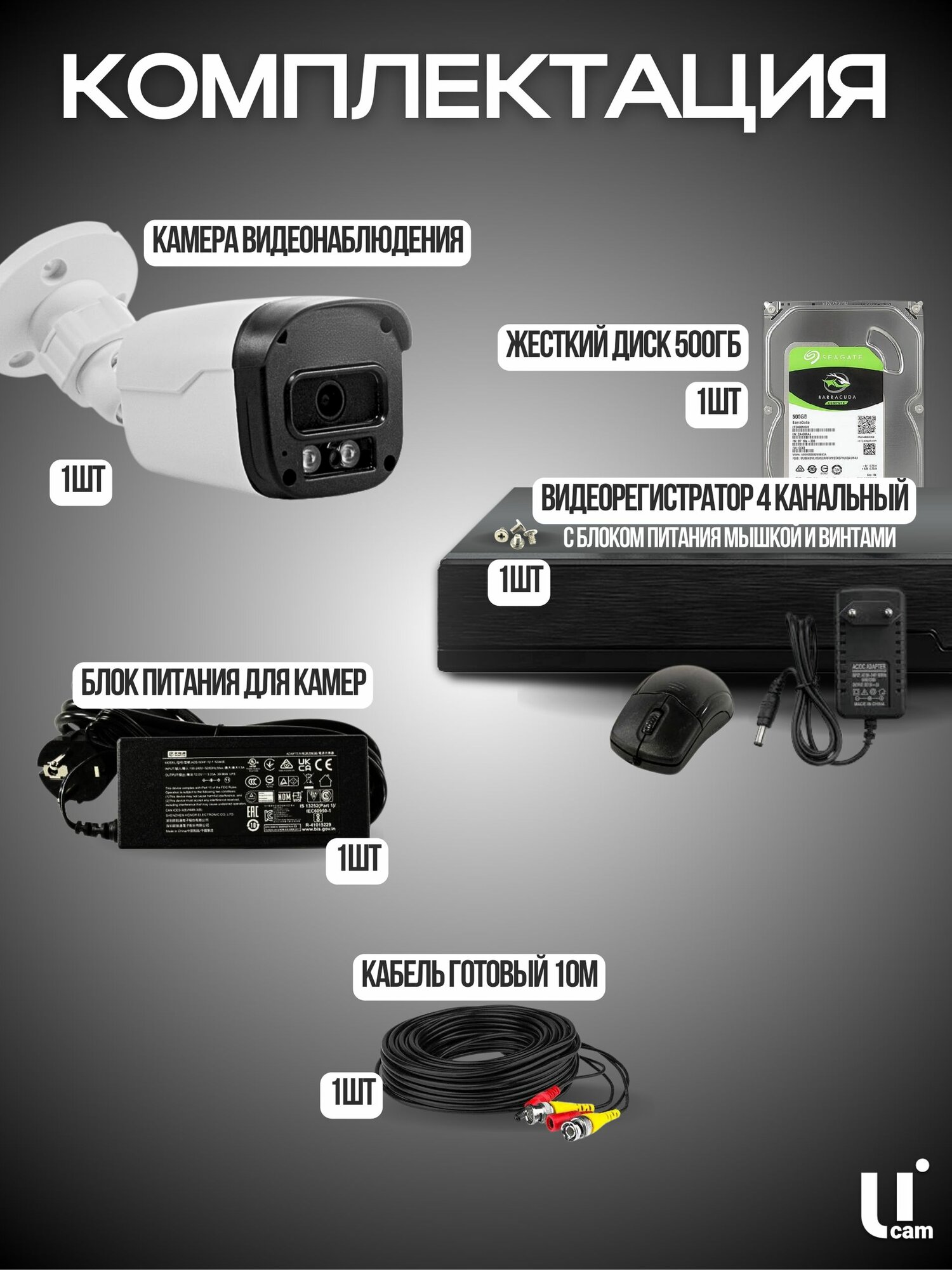 Комплект видеонаблюдения с жестким диском и готовыми кабелями, 1 камера 2Мп, Ucam интересное: