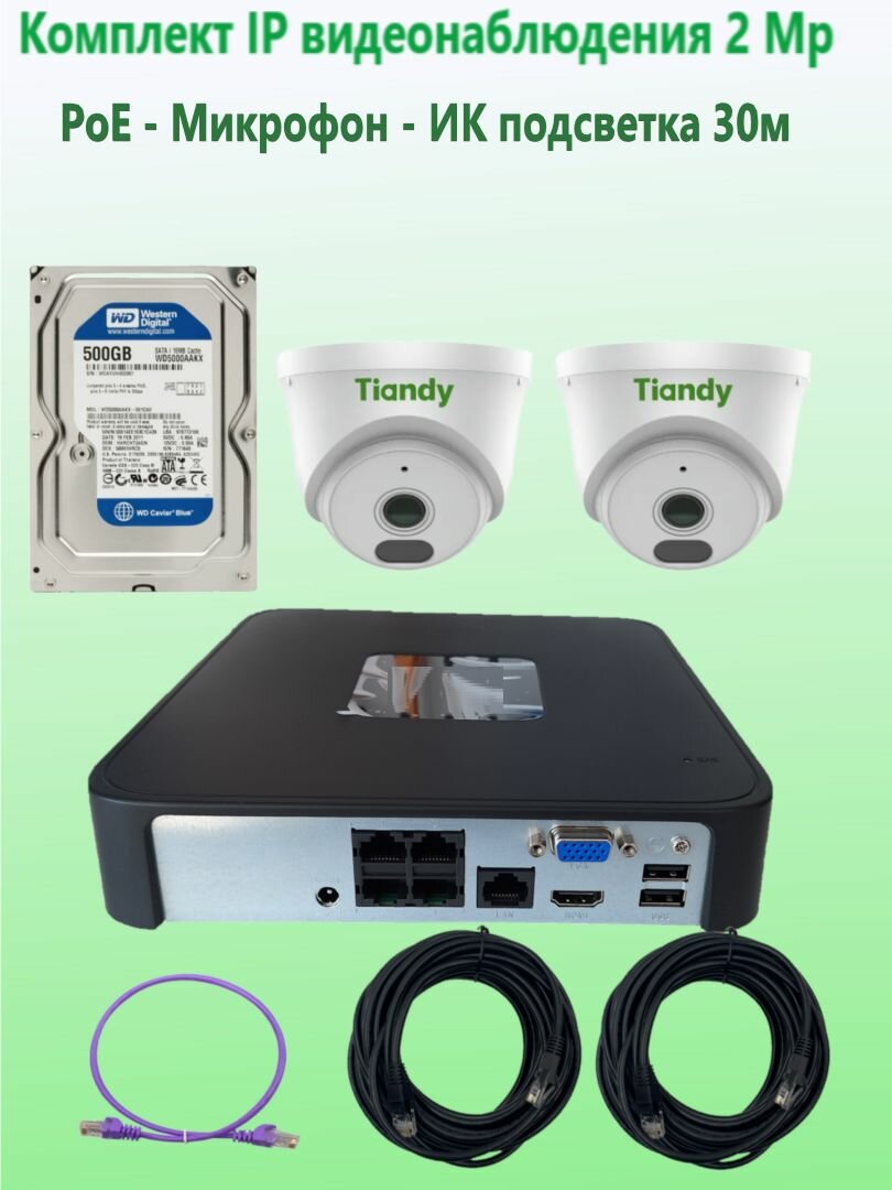 Купить Комплект IP видеонаблюдения с жестким диском на 2 камеры, PoE, 2Мп с микрофоном + готовый кабель