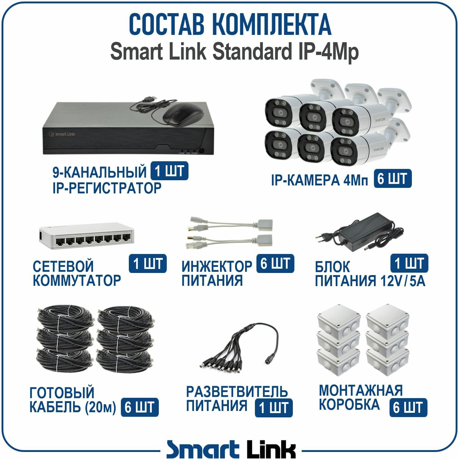 Купить Комплект IP-видеонаблюдения уличный Smart Link SL-IP4M6B, 6 камер 4Мп, с записью на HDD до 8Tb, для дома/дачи/бизнеса