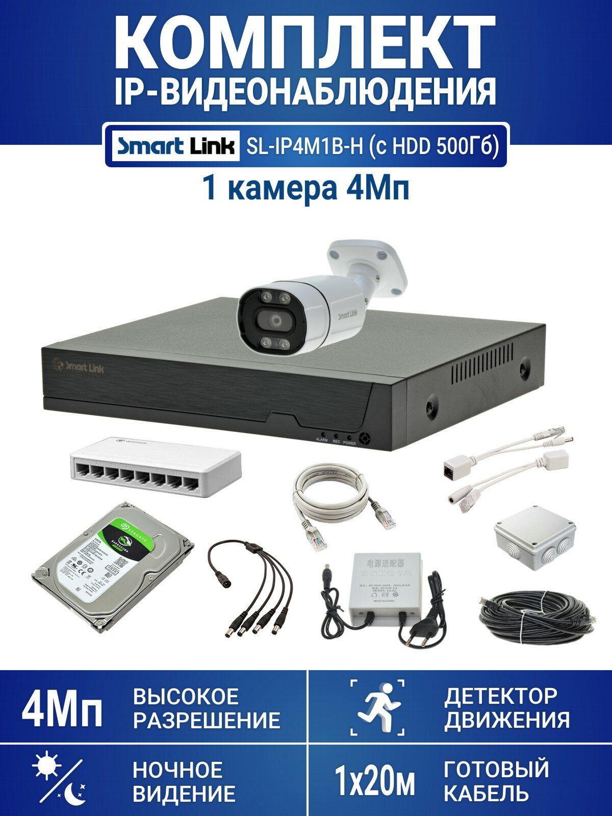 Комплект IP-видеонаблюдения уличный Smart Link SL-IP4M4B-H, 4 камеры 4Мп, с жёстким диском 500Gb, для дома/дачи/бизнеса