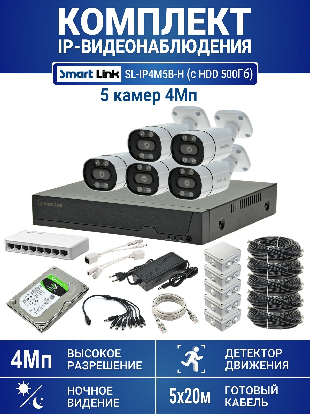 Купить Комплект IP-видеонаблюдения уличный Smart Link SL-IP4M5B-H, 5 камер 4Мп, с жёстким диском 500Gb, для дома/дачи/бизнеса