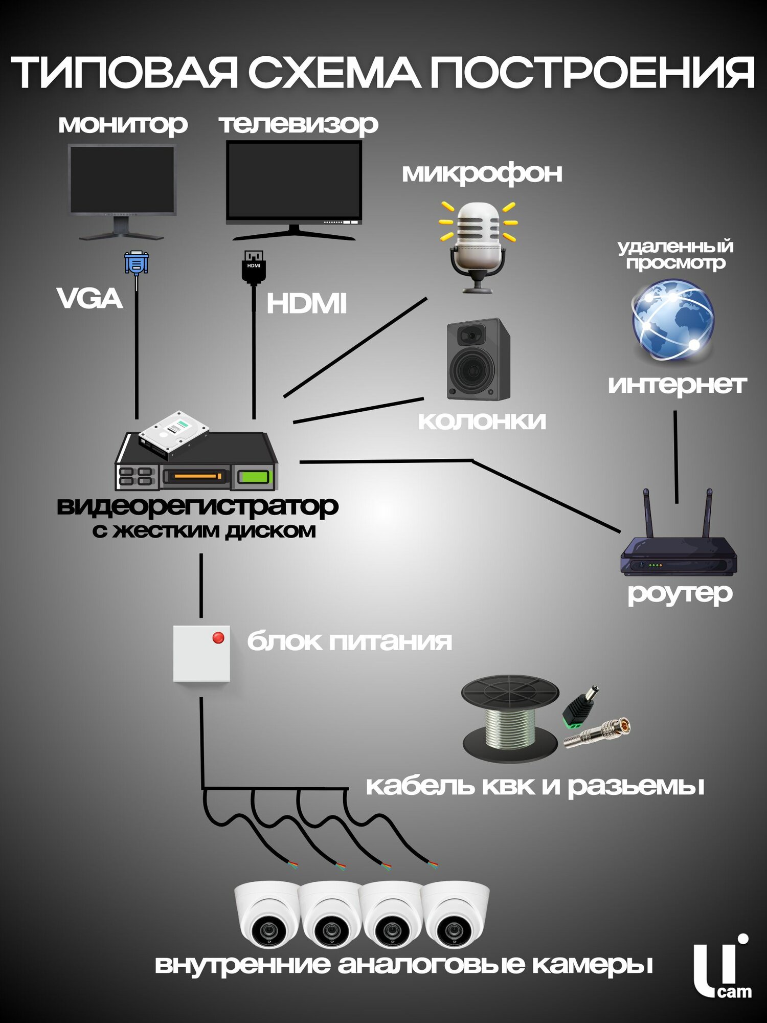 Система видеонаблюдения Ucam, 4 канала, 16 камер, ИК-подсветка, 2Мп, Full HD