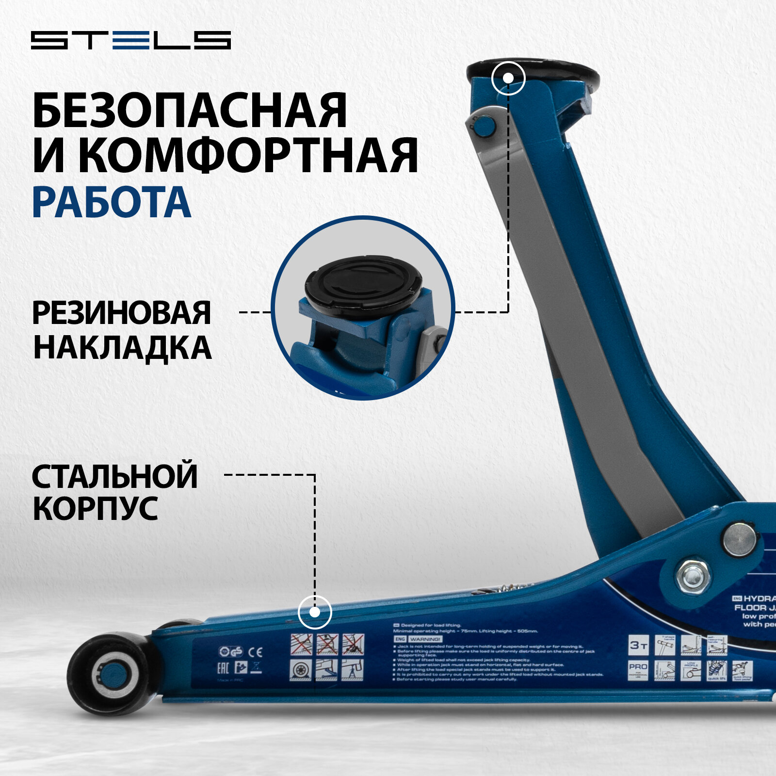 Домкрат гидравлический подкатной Stels 51137, 3 т, низкий подхват, высота подъема 75505 мм 501444 .