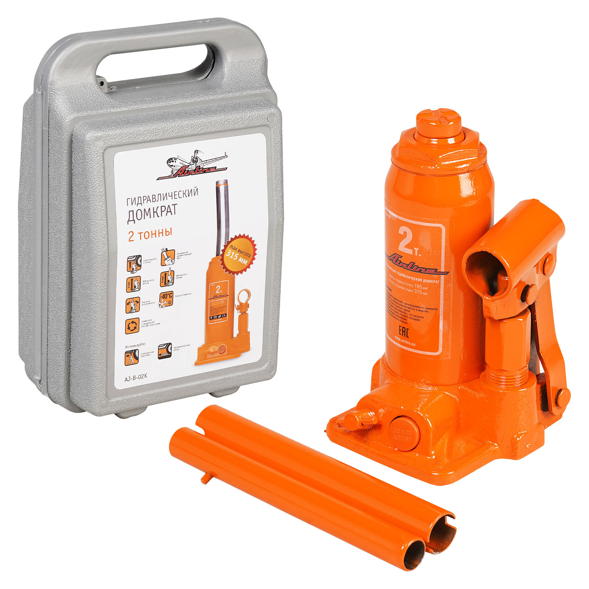 Airline AJ-B-02K (410210 / AJB02K) домкрат бутылочный 2т в кейсе (min - 165 мм, max - 315 мм) (aj-b-02k)