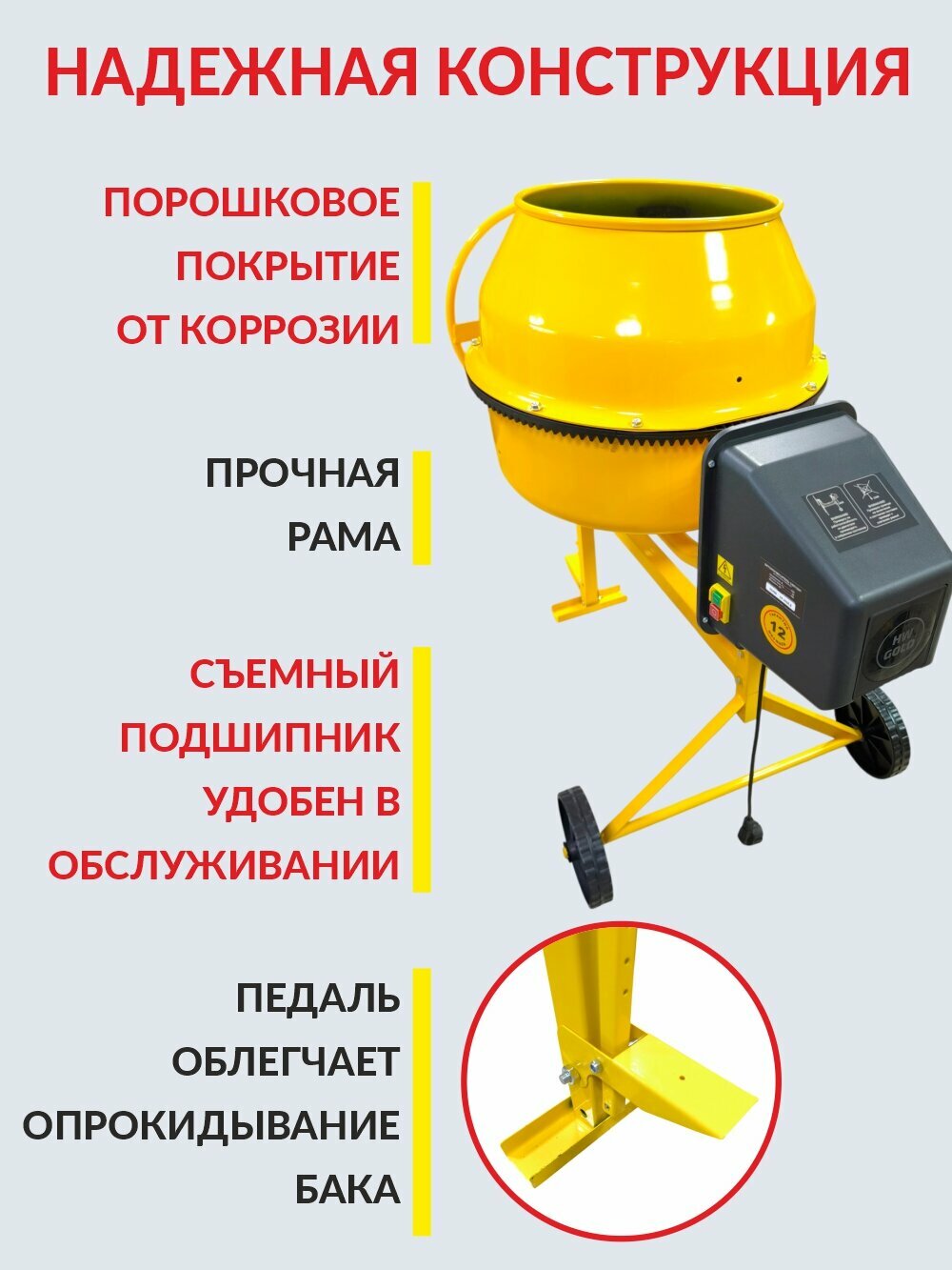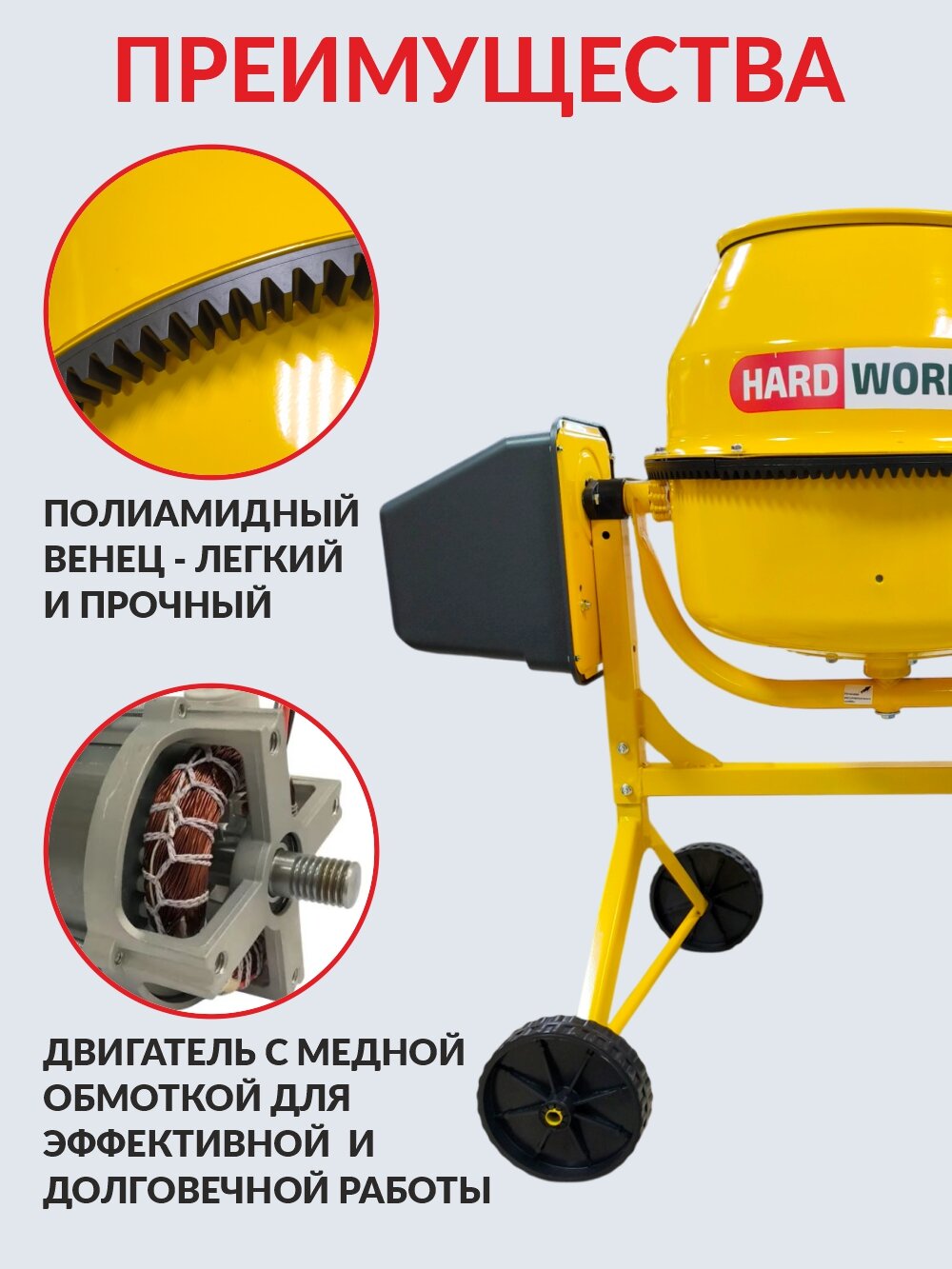 Бетономешалка строительная HARD WORKER СБП120П, бетоносмеситель электрический 550 Вт, с педалью, полиамидный венец интересное: