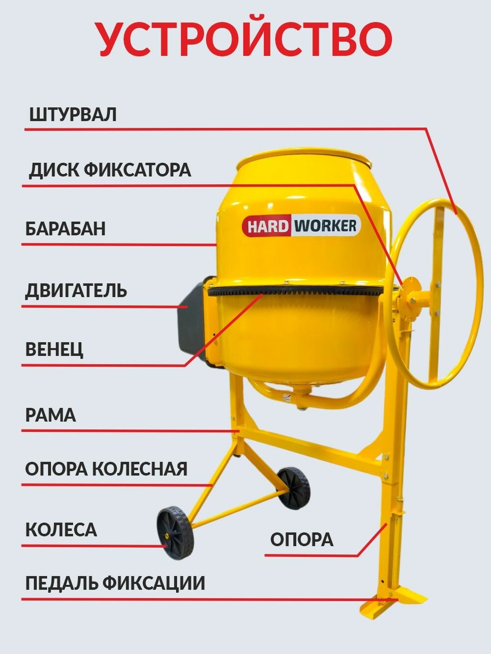Бетономешалка строительная HARD WORKER СБП180П, бетоносмеситель электрический 700 Вт, с педалью, полиамидный венец интересное: