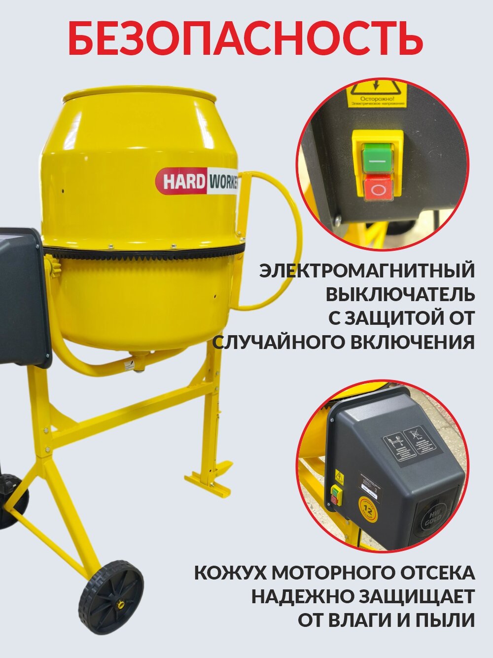 Бетономешалка строительная HARD WORKER СБП140П, бетоносмеситель электрический 550 Вт, с педалью, полиамидный венец интересное: