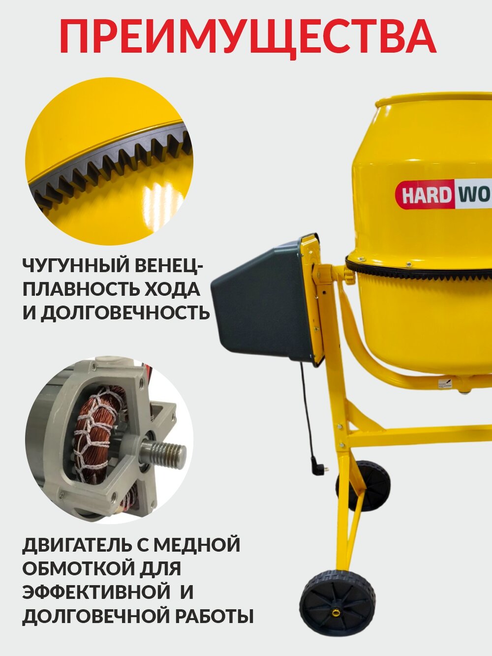 Бетономешалка строительная HARD WORKER СБП180, бетоносмеситель электрический 700 Вт, с педалью, чугунный венец интересное: