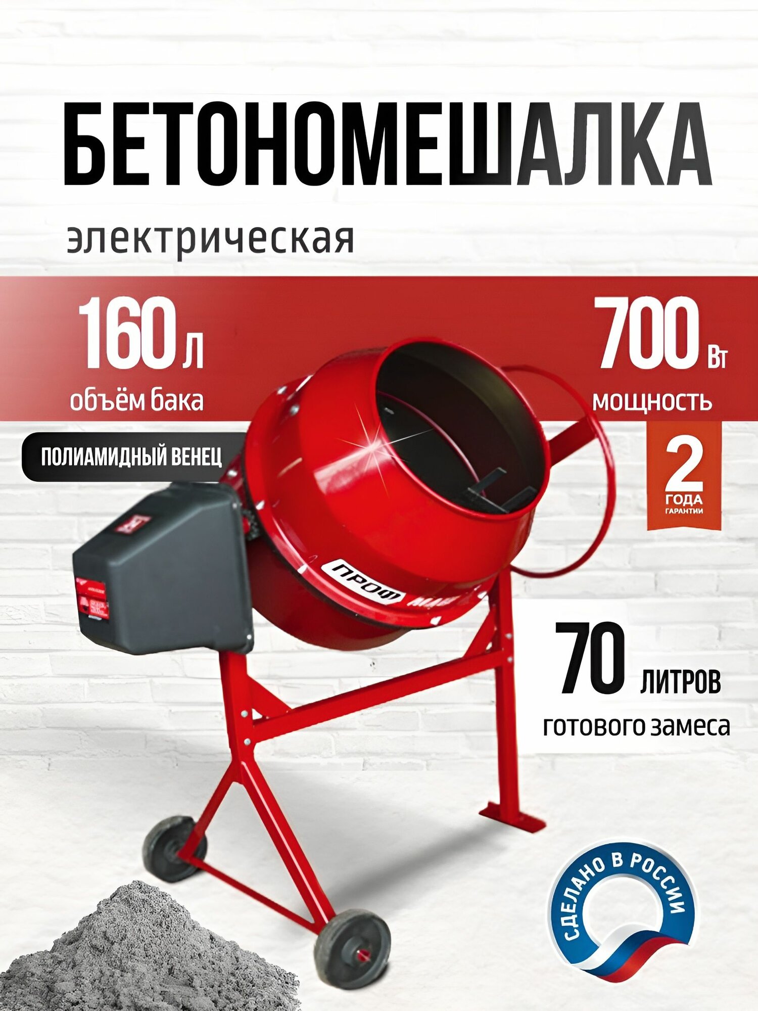Бетономешалка строительная, бетоносмеситель профмаш Б-160 700 Вт, 160 л чугунный венец