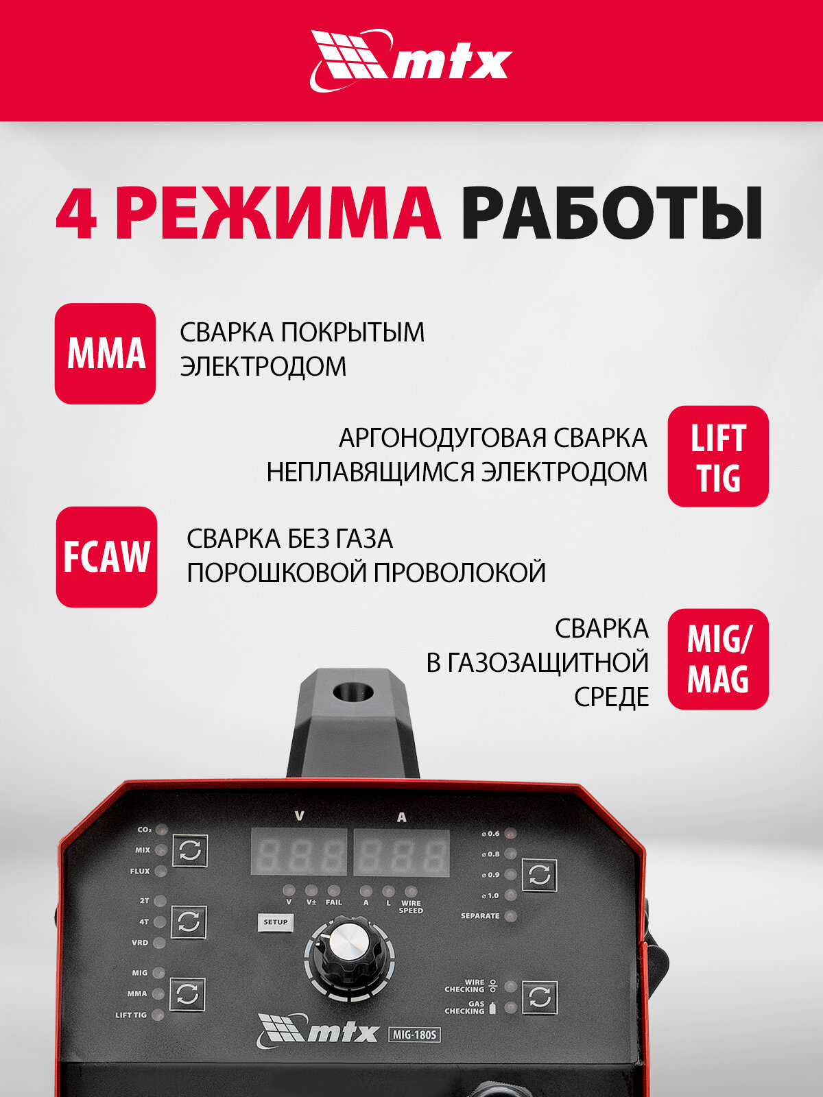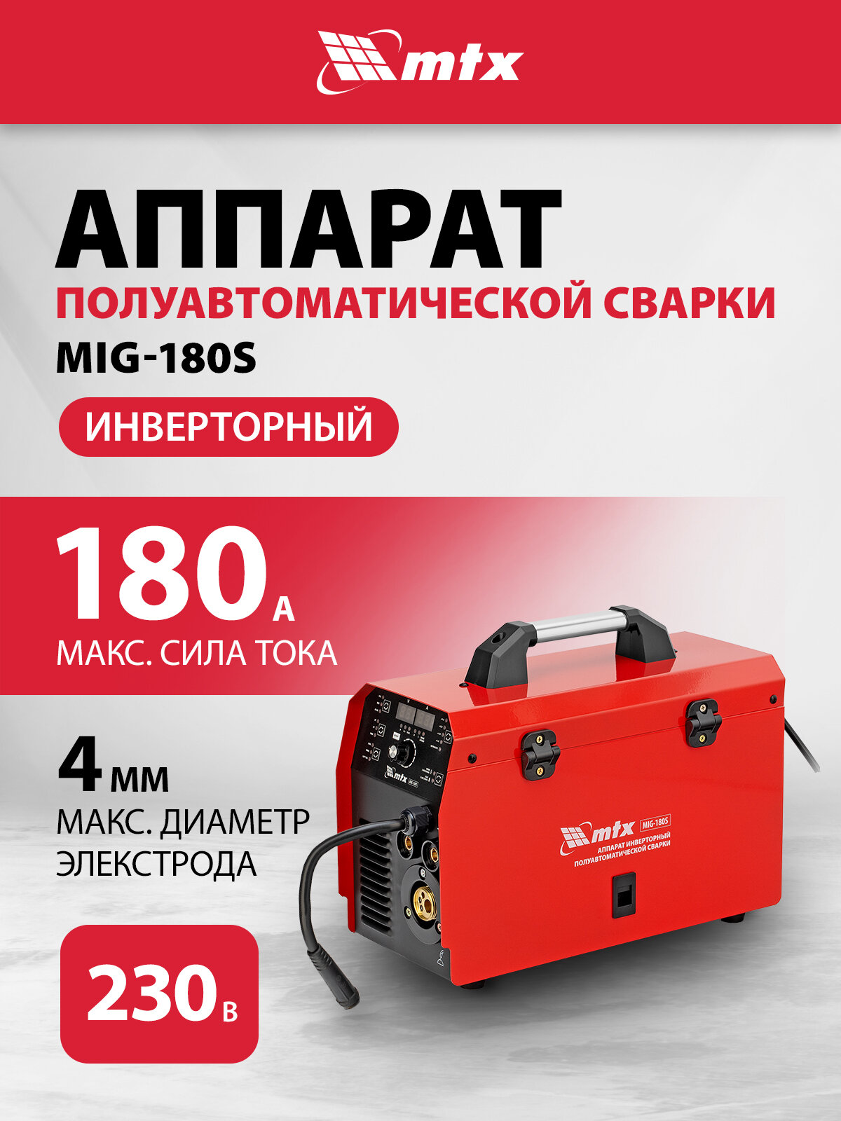 Сварочный аппарат-полуавтомат инверторный MTX MIG-180S, 180A, ПВ 60%, катушка 5 кг 94302 интересное: