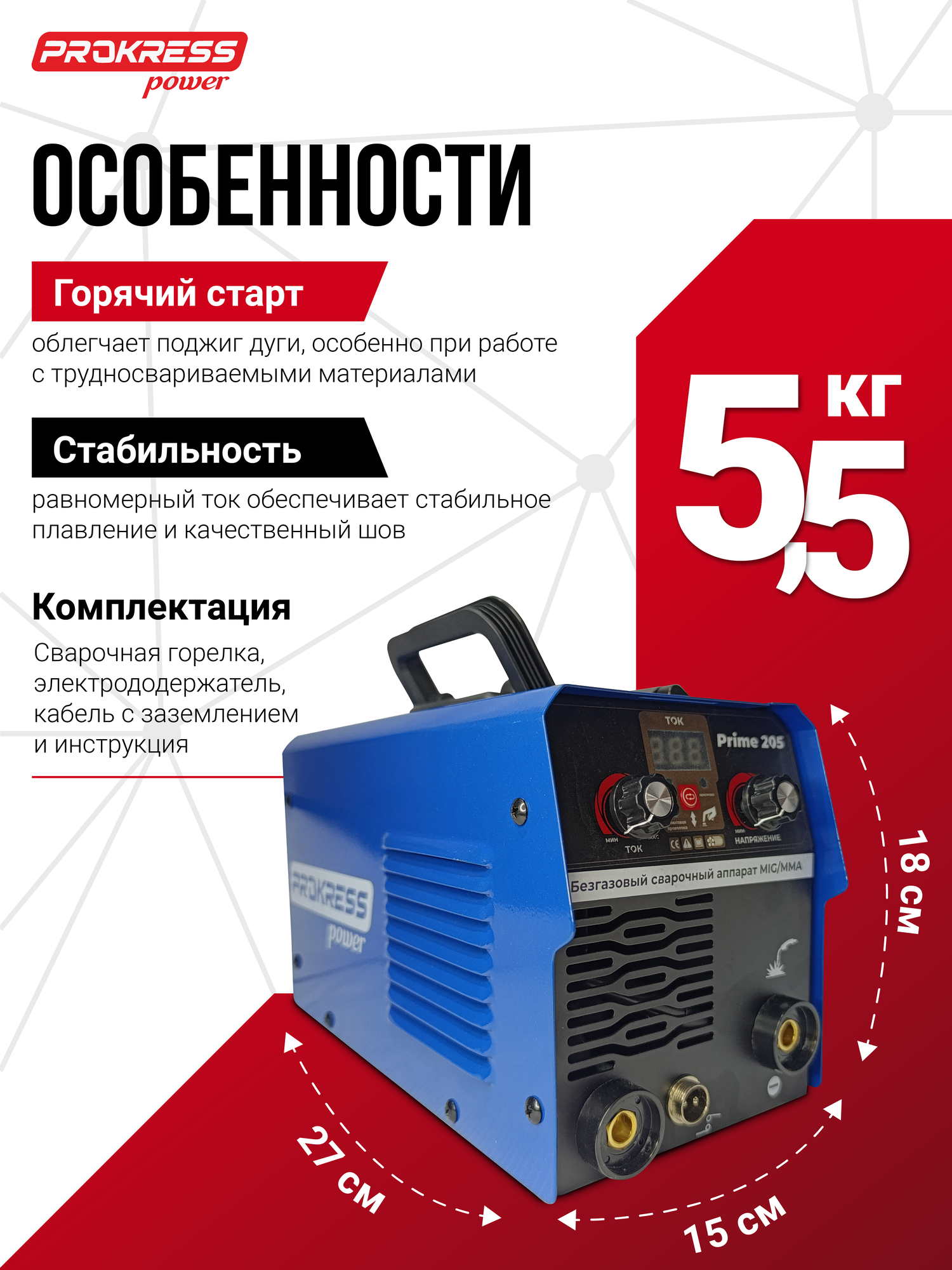 Полуавтомат PROKRESSPOWER PRIME 205 (MIG/MMA 20-205А, без газа, цифровой дисплей, съемная горелка). интересное: