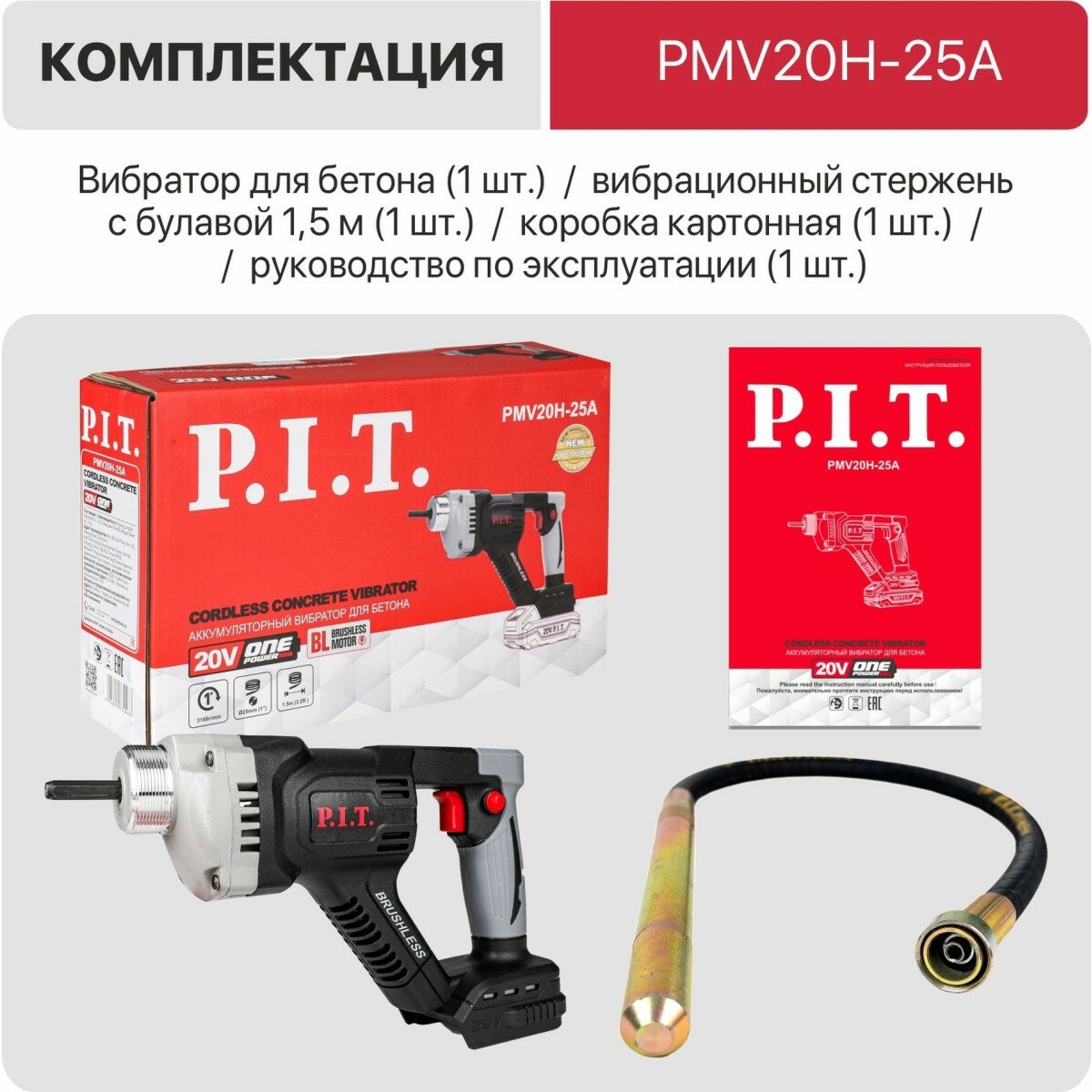 Вибратор P.I.T. PMV20H-25A аккумуляторный без АКБ и ЗУ, вал 1,5 м, вибронаконечник 25 мм интересное:
