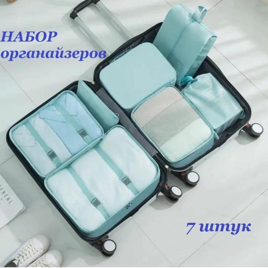 Большой набор из 7 дорожных органайзеров / Комплект сумок для размещения вещей в чемодане, для хранения в шкафу бирюзовые