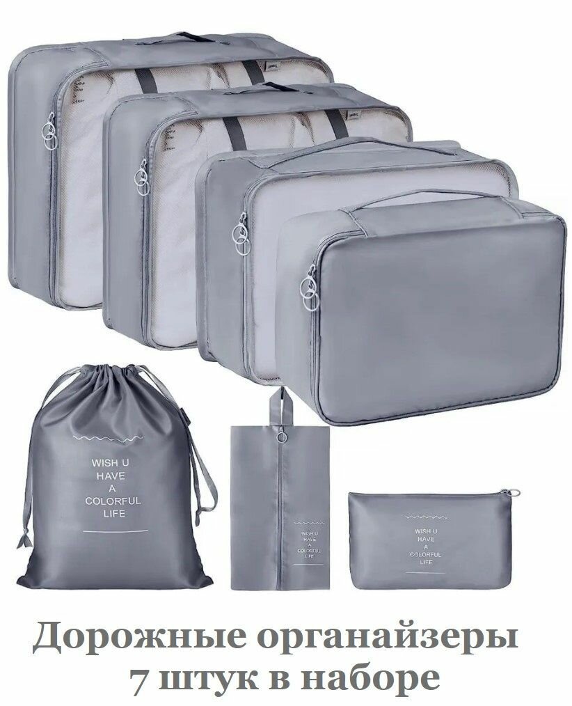 Купить Набор органайзеров дорожных 7 штук / Система хранения вещей в шкафу, для размещения в чемодане серый