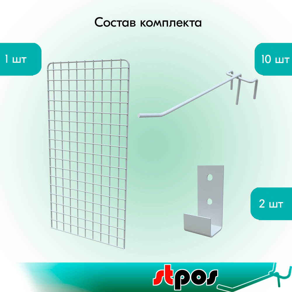 Купить КОМПЛЕКТ Сетка 700х350 с П-образной окантовкой, Белый + Крючки одинарные 175мм, d4, шаг 50мм, Белый – 10 шт+ Кронштейн