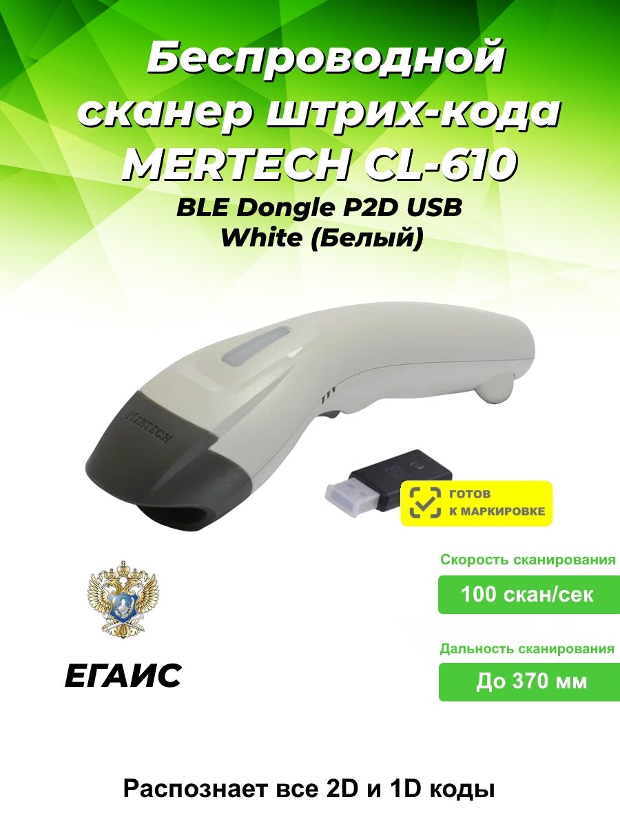 Купить Беспроводной сканер штрих-кода MERTECH CL-610 BLE Dongle P2D USB Белый
