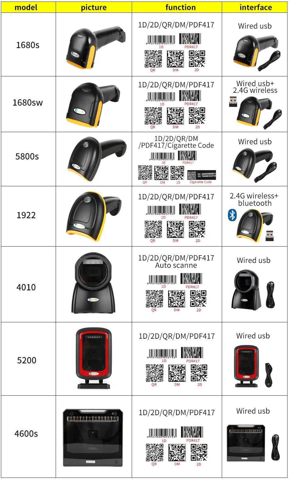 Сканер штрих-кода CHIYI 1680SW/1922 Bluetooth, 5800 wired scanner
