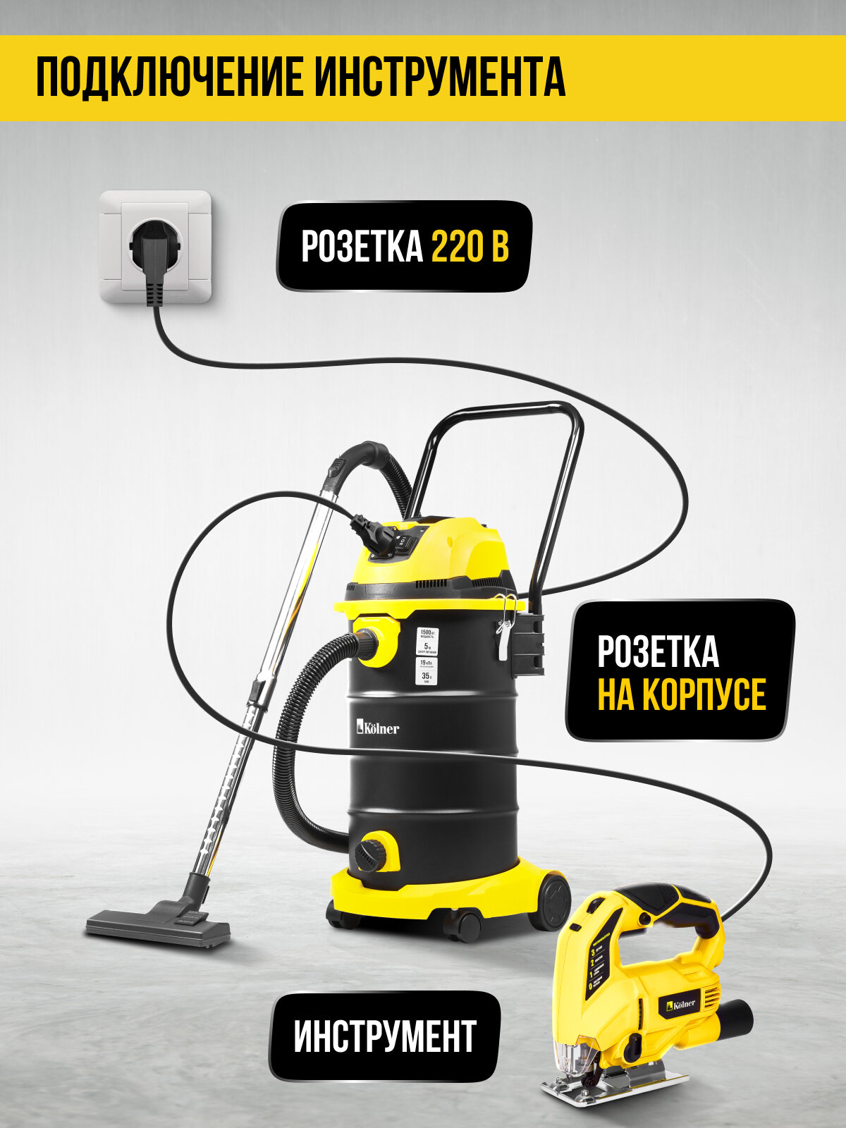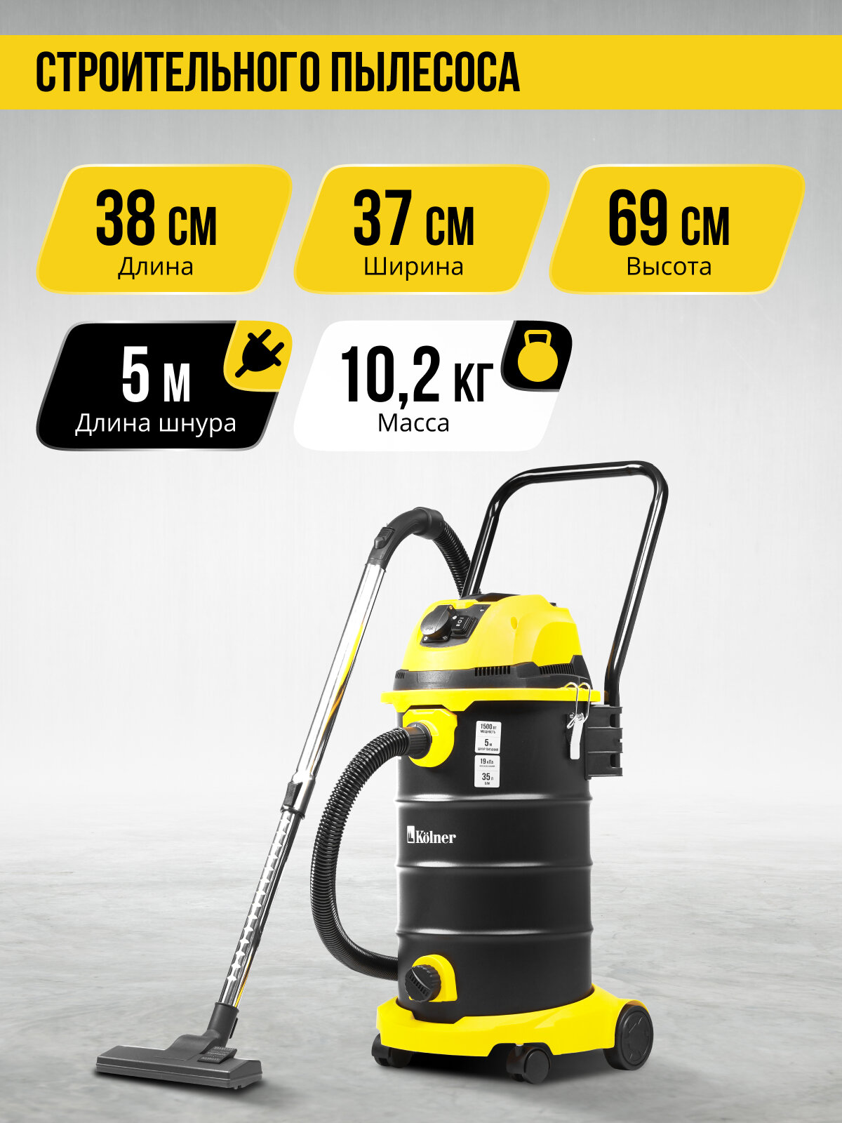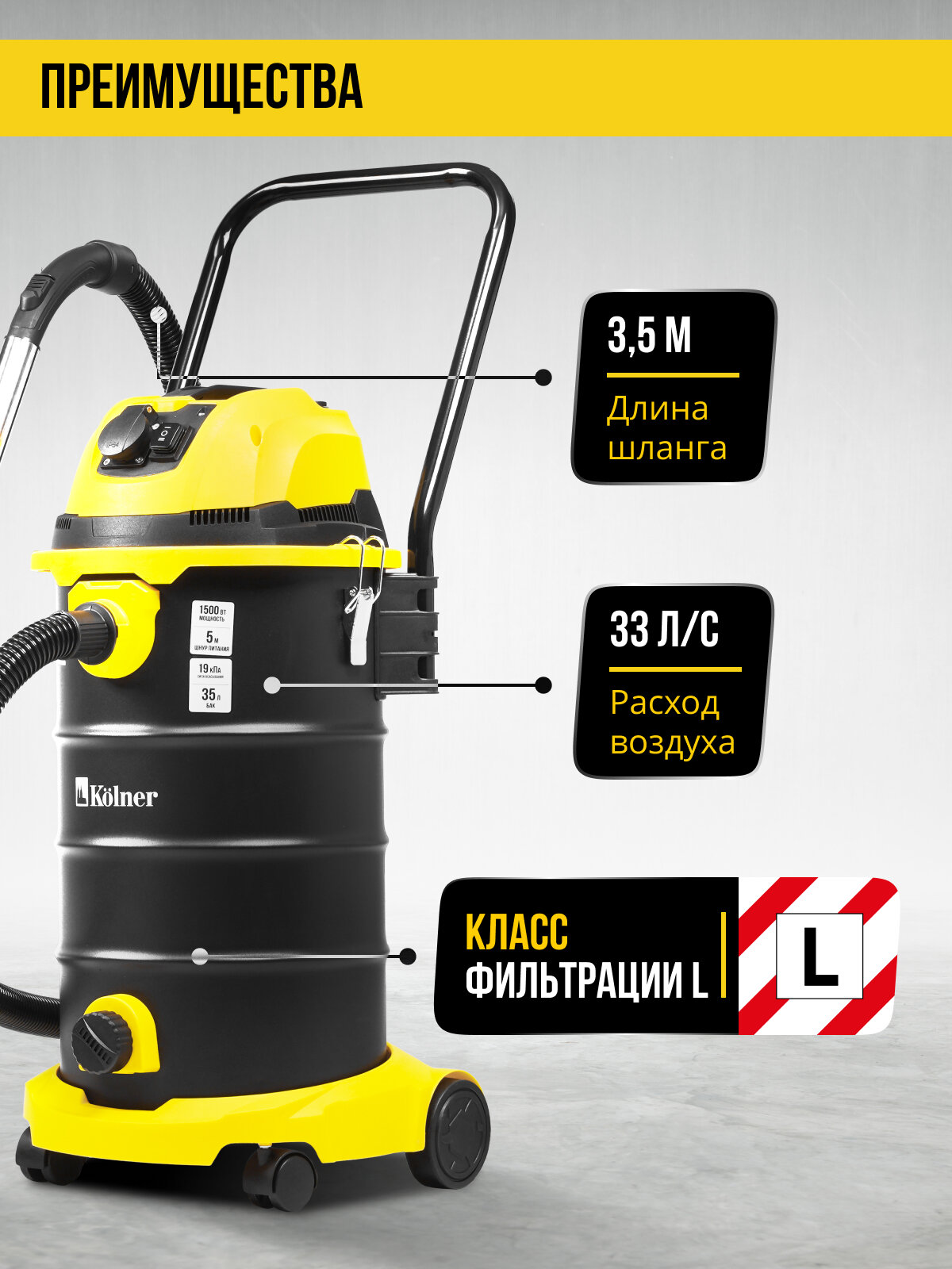 Пылесос строительный Kolner "KVC 35L-FS", мощность всасывания 1500Вт, расход воздуха 33 л/с, чёрный интересное: