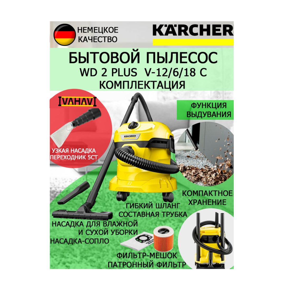 Хозяйственный пылесос Karcher WD 2 Plus V-12/6/18/C+узкая насадка для химчистки, переходник 5 ст. интересное: