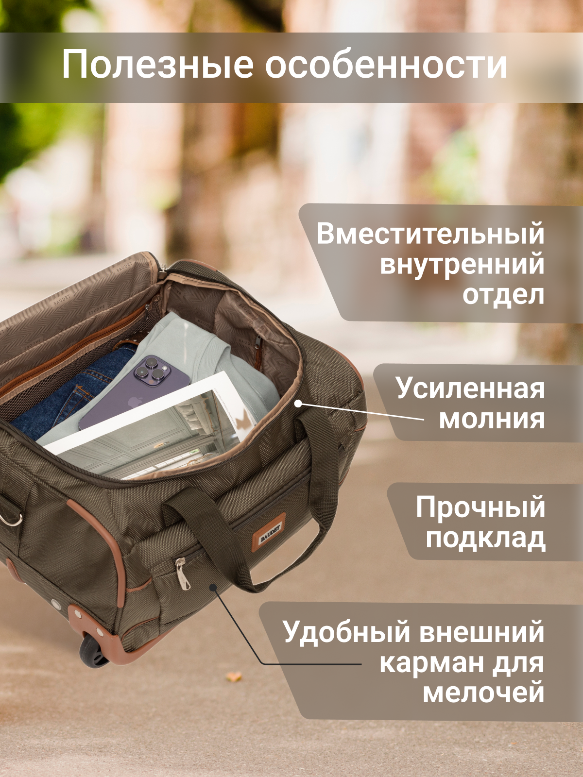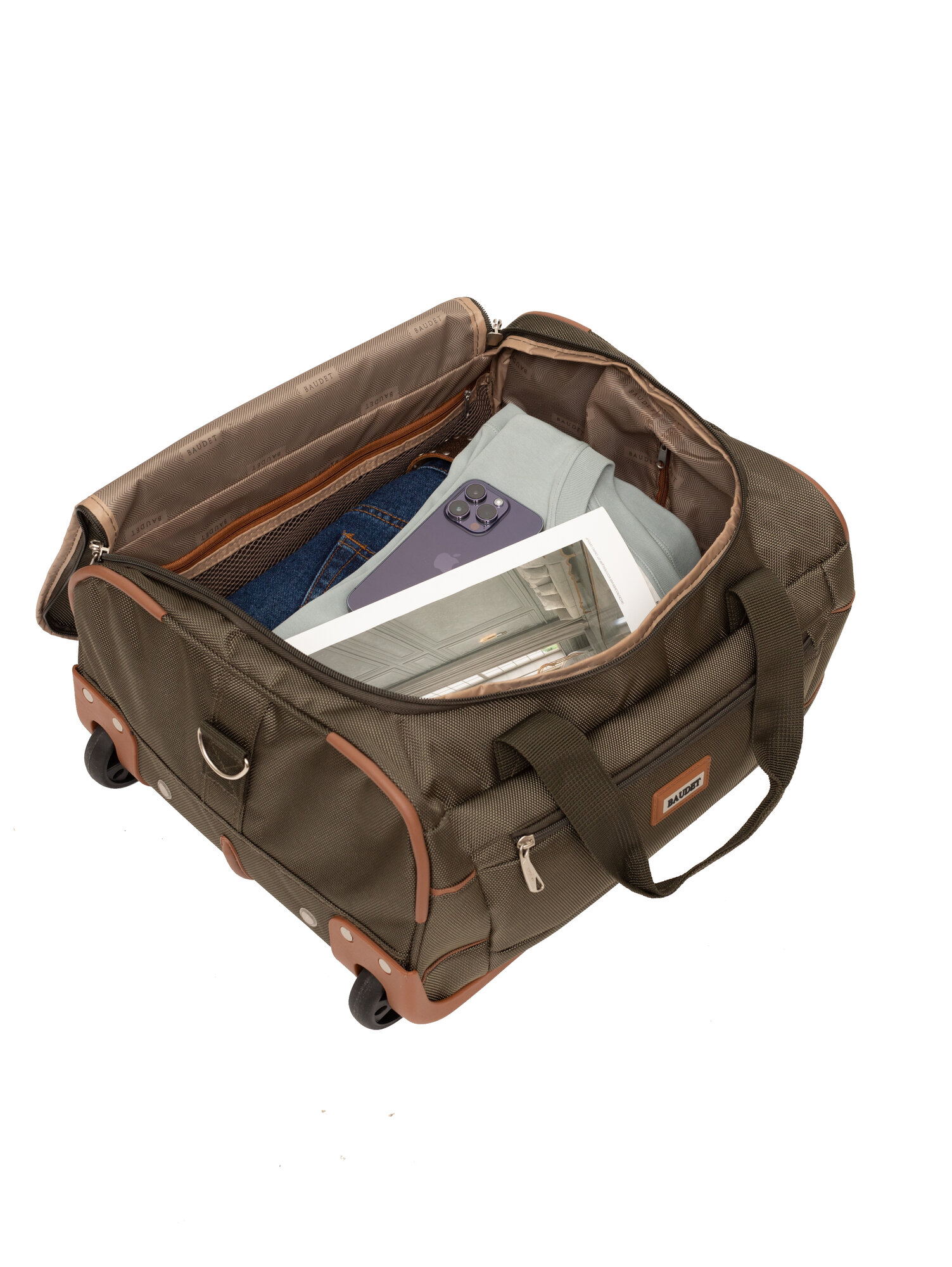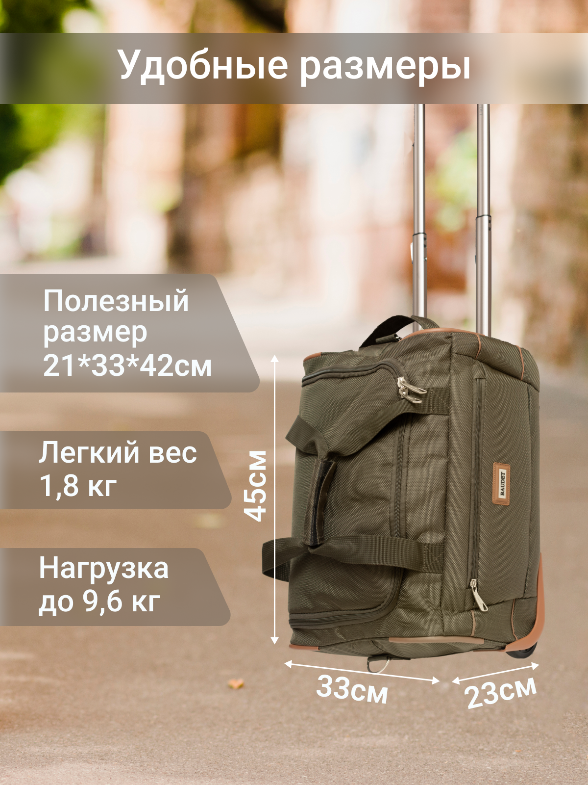 Сумка дорожная BAUDET, 29 л, 33х45х23 см, ручная кладь, зеленый/коричневый интересное: