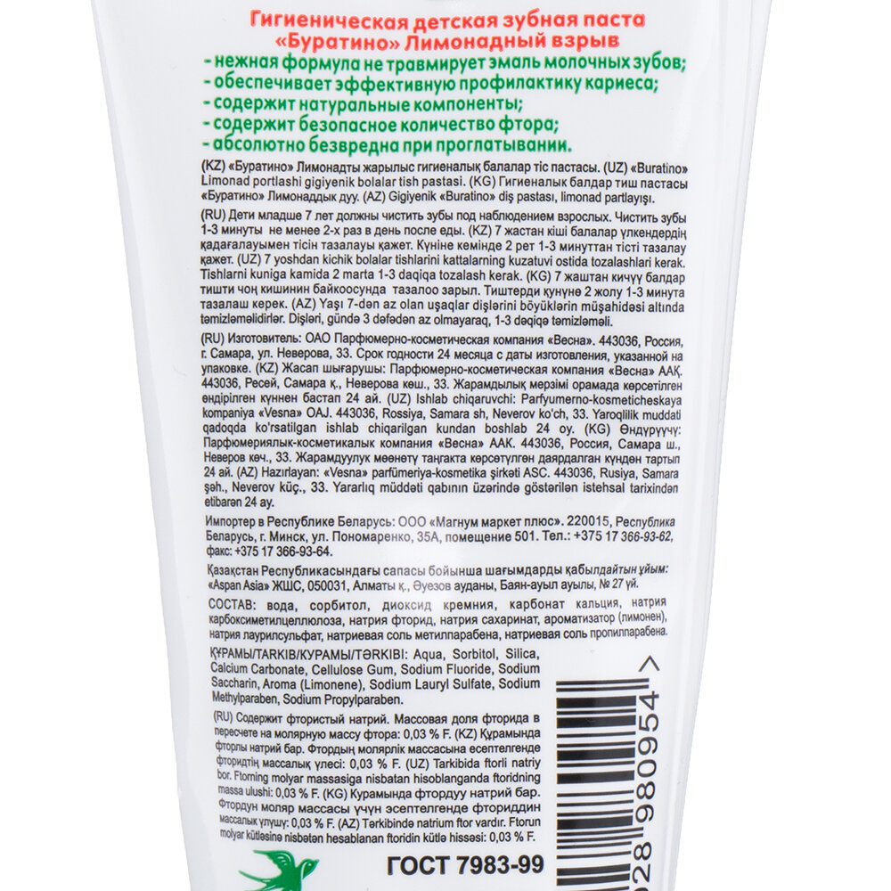 Зубная паста детская 75 мл буратино (Весна) "Лимонадный взрыв", бережно очищает, 1827 упаковка 8 шт.