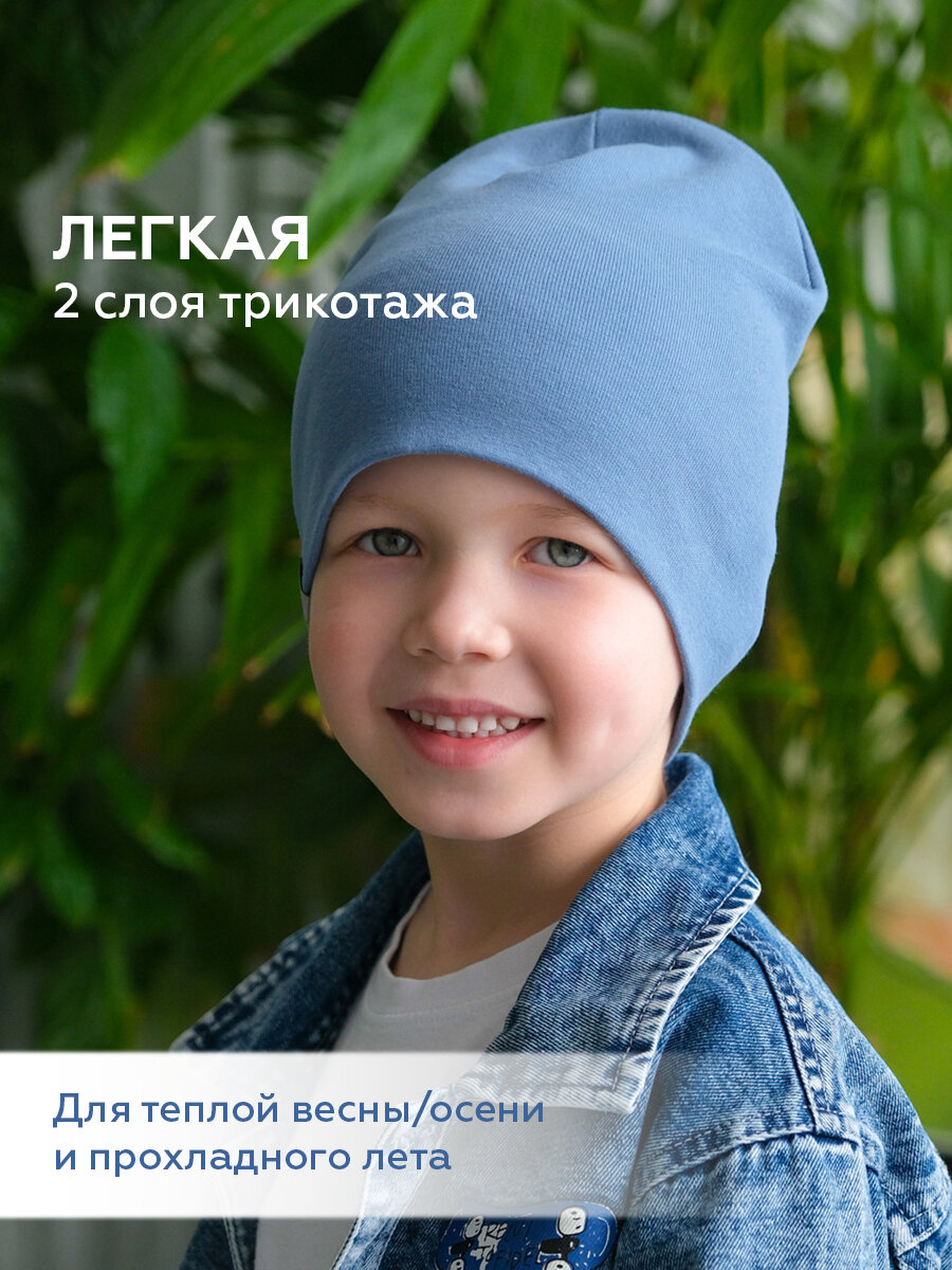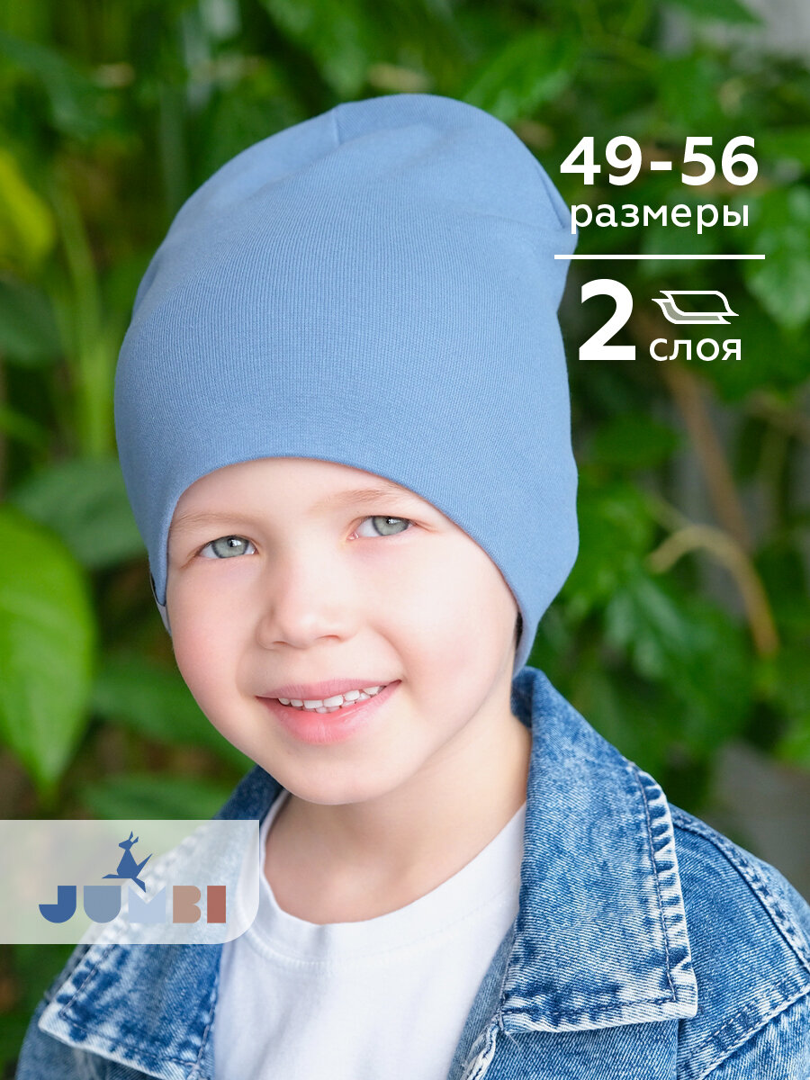Шапка-бини JUMBI Шапка для девочек и мальчиков весна лето осень трикотажная двухслойная для детей, размер 53-56, синий меланж