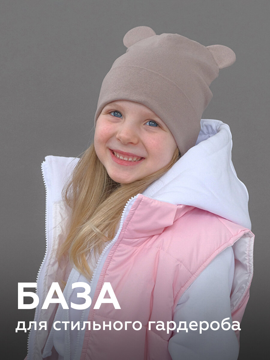 Шапка-бини JUMBI Шапка для девочек весна лето осень трикотажная двухслойная с ушками для девочек, размер 45-48, безе