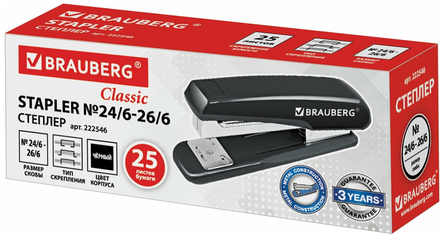 Степлер №24/6, 26/6 BRAUBERG "Classic", до 25 листов, черный, 222546 В комплекте: 1шт.