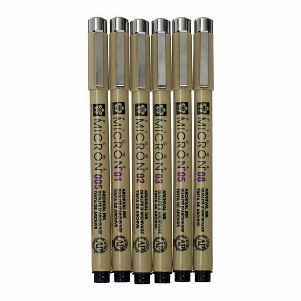 Набор капиллярных ручек Sakura Pigma Micron, 6 штук (0.2 мм, 0.25 мм, 0.3 мм, 0.35 мм, 0.45 мм, 0.5 мм), цвет чернил: черный