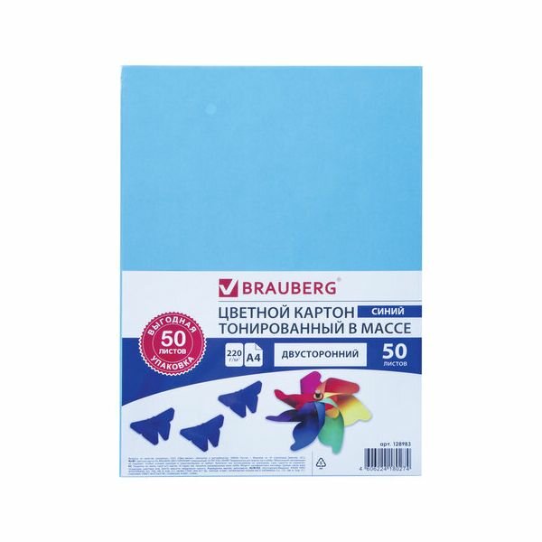 Цветной картон тонированный в массе BRAUBERG, A4, 50 л. 1 наборов в уп. 50 л. , синий