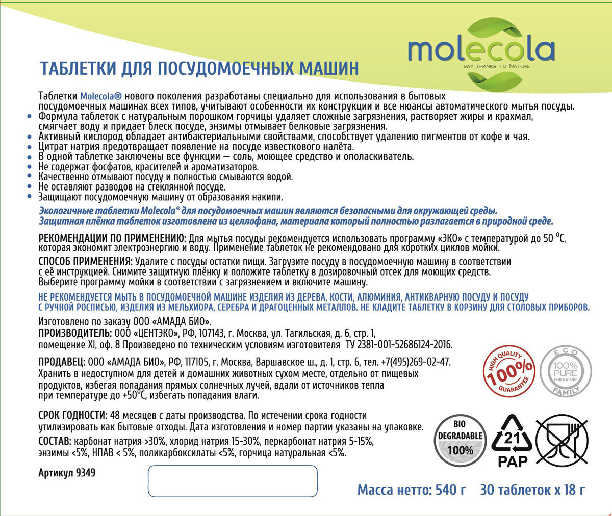 Таблетки для посудомоечных машин Molecola, экологичные, 30шт